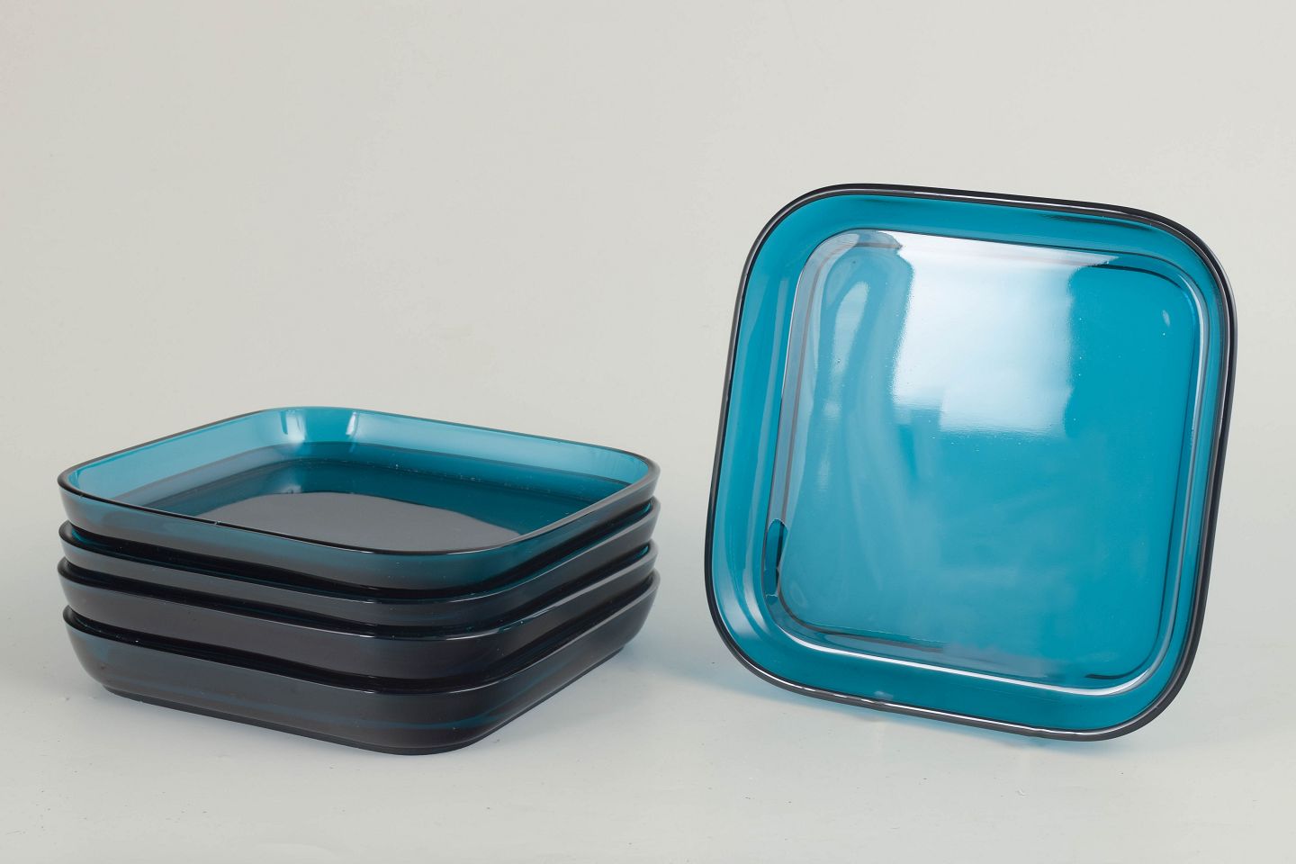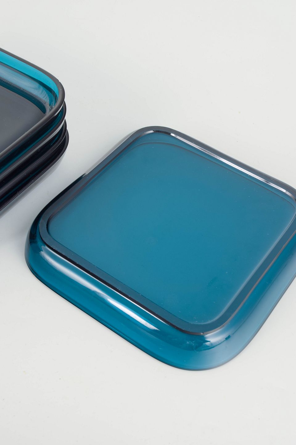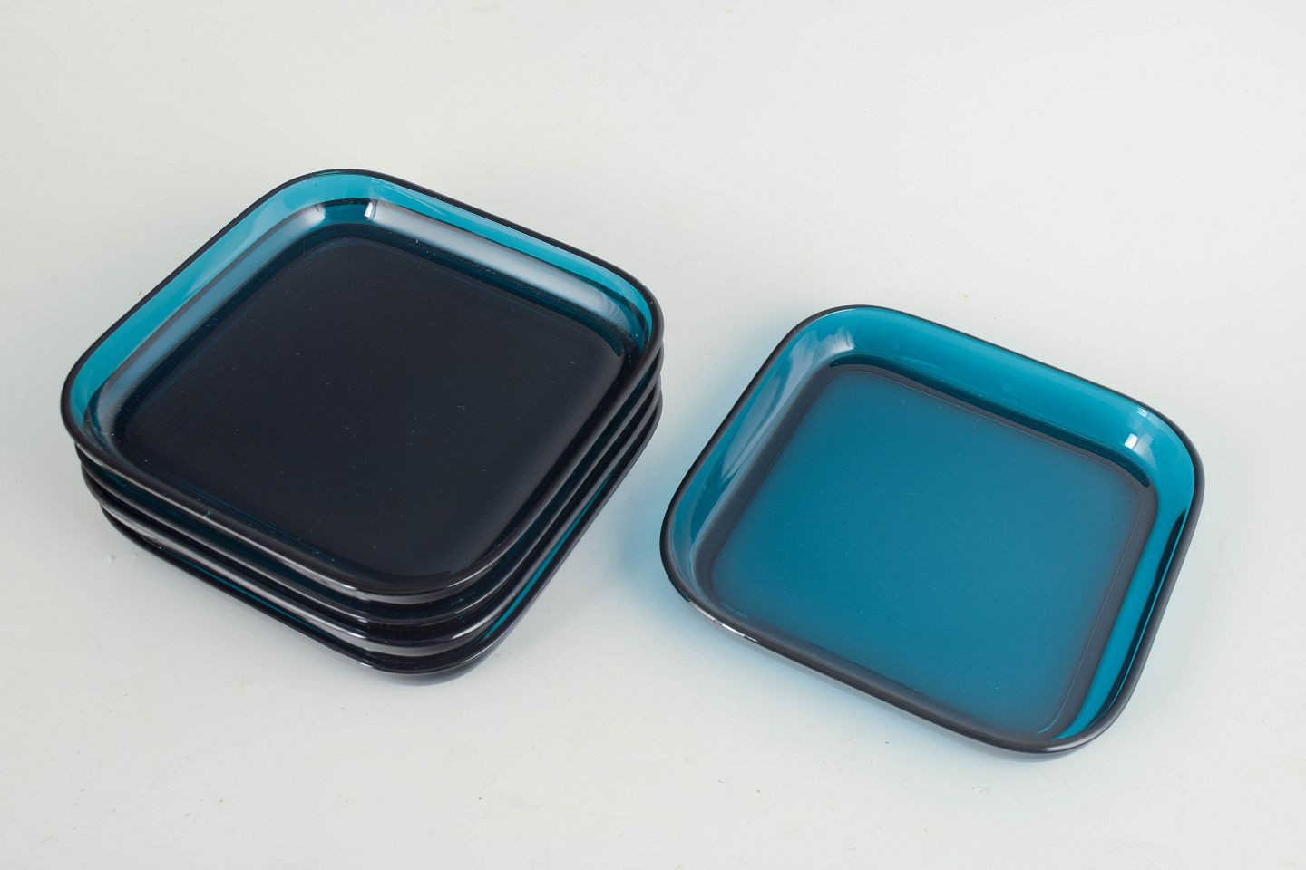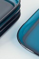 Sæt bestående af fem lave, kvadratiske fade i håndlavet kunstglas med blødt afrundede hjørner og transparent blågrøn tone. Enkelt, stramt formsprog med let hævet kant og glatpoleret overflade, hvor lyset fremhæver glassets dybde og farvespil.