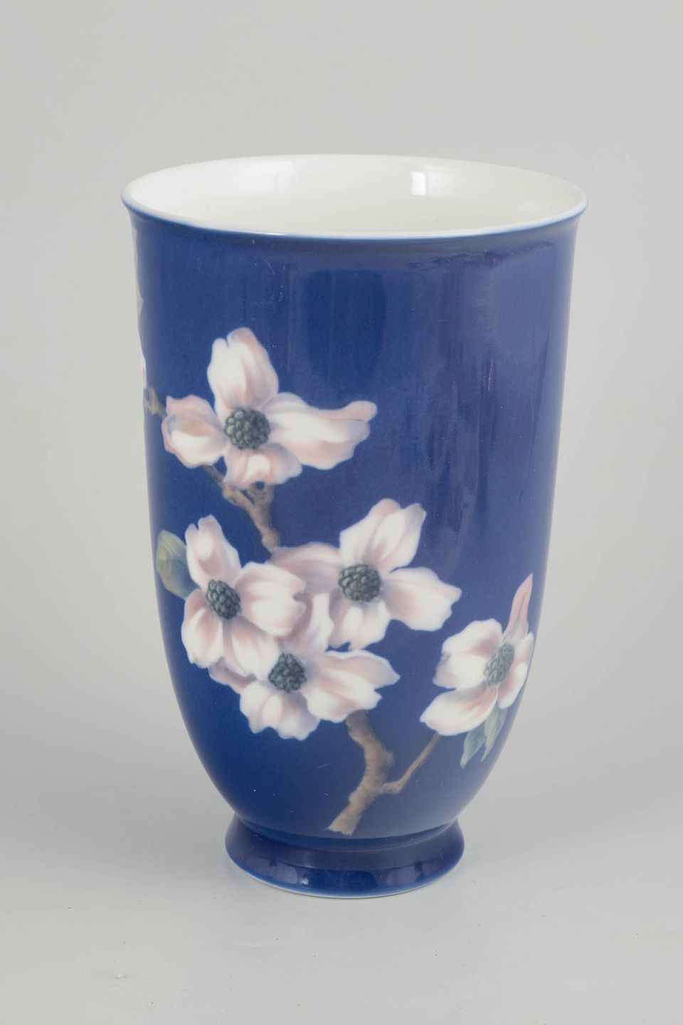 Tall cylindrical porcelain vase with a deep cobalt blue ground and a hand-painted underglaze decoration of flowers in soft pink and white tones with subtle grey detailing. The contrasting decoration accentuates the clean, upright form of the vase, resulting in a refined and elegant appearance.