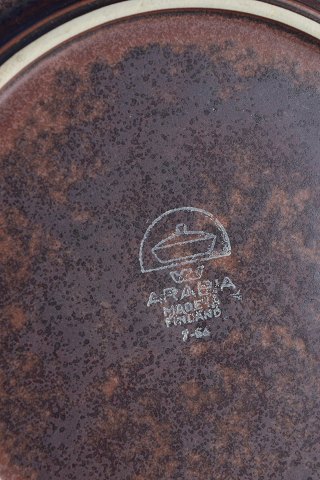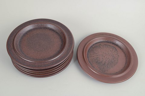 Set of six stoneware salad plates from the Ruska series by Arabia, finished in the distinctive mottled brown glaze in warm earth tones. Classic circular form with a gently raised rim and a lively glaze surface, where natural variations give each plate an individual character.