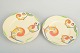 Art deco-kagetallerkener i fajance med farverig, håndmalet dekoration i “Syren”-serien. Tallerkenerne har rund form med let fane og et levende, stiliseret blomstermotiv i klare, tidstypiske farver, karakteristisk for Clarice Cliffs produktion i mellemkrigstiden.