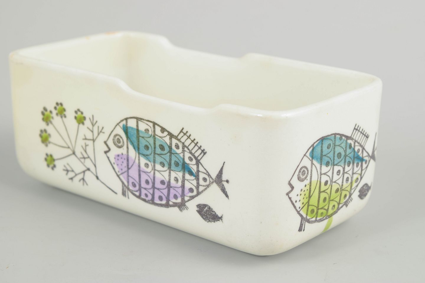 Sjælden rektangulær smørkrukke i fajance med originalt låg i lysegrøn glasur. Dekoreret med stiliserede fisk og planter i turkise, lilla og grønne nuancer – et legende og karakteristisk motiv fra Rörstrands “Petri” serie.