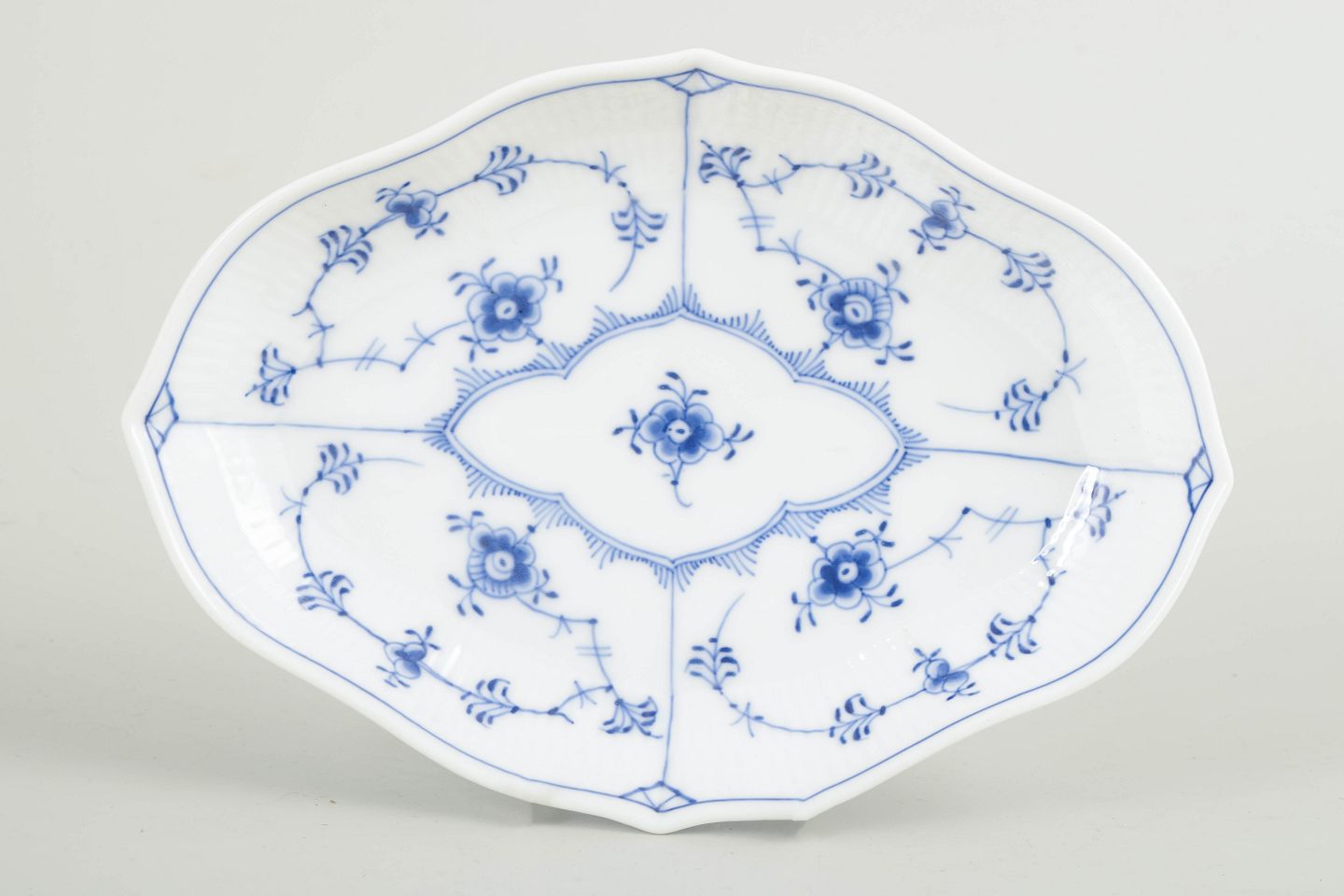 Ovalt porcelænsfad dekoreret med håndmalet koboltblåt underglasur i det klassiske Musselmalet Riflet mønster. Modellen er 1/147 og kendetegnes ved den let facetterede, blødt svungne form med profileret rand og opdelt spejl, rigt udsmykket med blomster- og rankemotiver. Et elegant eksempel på Royal Copenhagens forfinede porcelænskunst fra mellemkrigstiden.