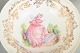 Sæt med fem fajanceskåle med trykt dekoration i pastelfarver med figurmotiv i midten samt rigt udformet, gylden bladranke-bort langs kanten.