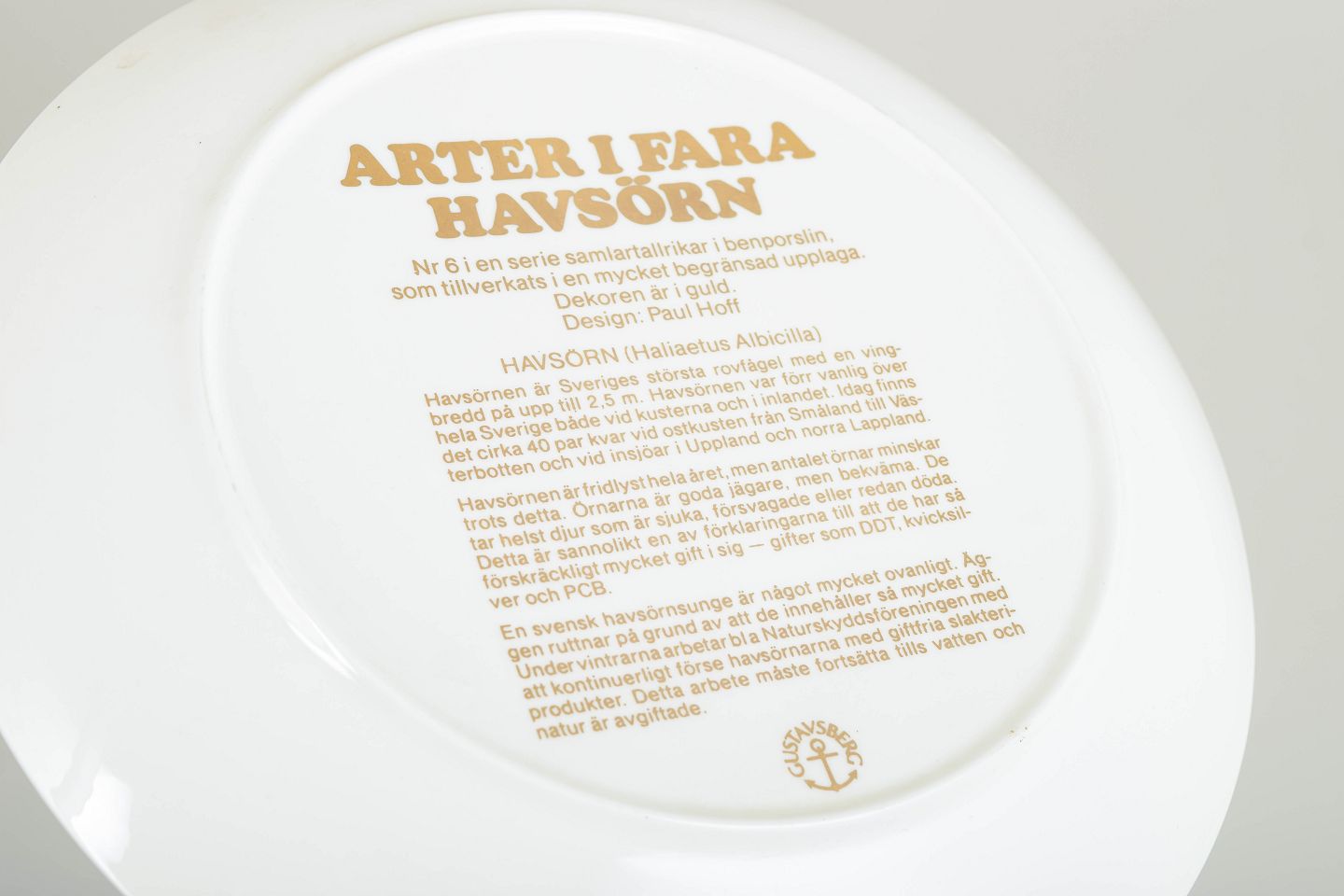 I 1980’erne lancerede Gustavsberg serien “Arter i fara” med fokus på truede dyrearter. Serien kombinerer detaljerede naturmotiver i metaldekoration med oplysende tekst på bagsiden og blev produceret i relativt begrænsede oplag, hvilket har givet den status som samlerobjekt inden for svensk porcelæn.