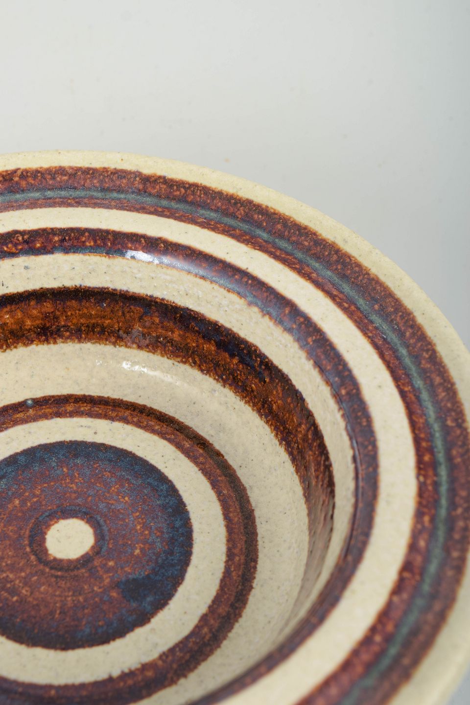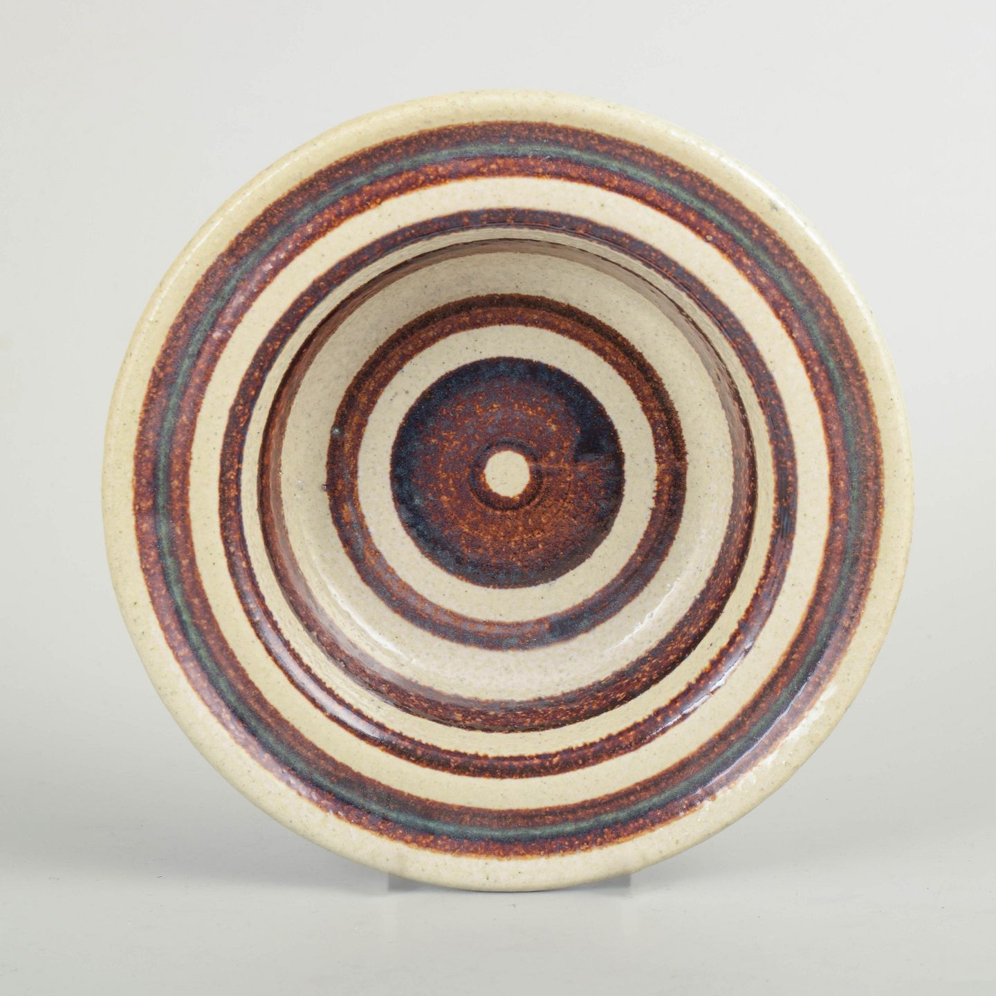 Lav, drejet skål i stentøj med dekor i koncentriske ringe i brune og blålige nuancer på lys bund. Formen og dekoren relaterer til “Hambo”-modellen.