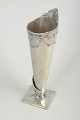 Skulpturelt udformet vase i tin med høj, konisk krop og rå, organisk kant med struktureret overflade. Monteret på kvadratisk fod.