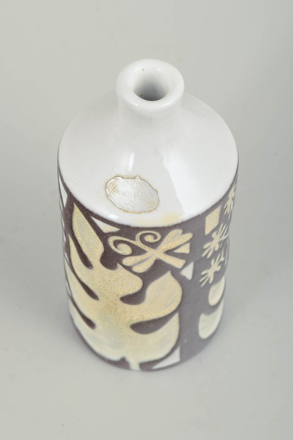 Cylinderformet vase i glaseret keramik med smal hals og grafisk dekoration i creme- og brunlige toner mod hvid bundglasur. Dekoren består af stiliserede bladmønstre og ornamentale elementer i et tydeligt modernistisk formsprog. Modelnummer 4330/683.