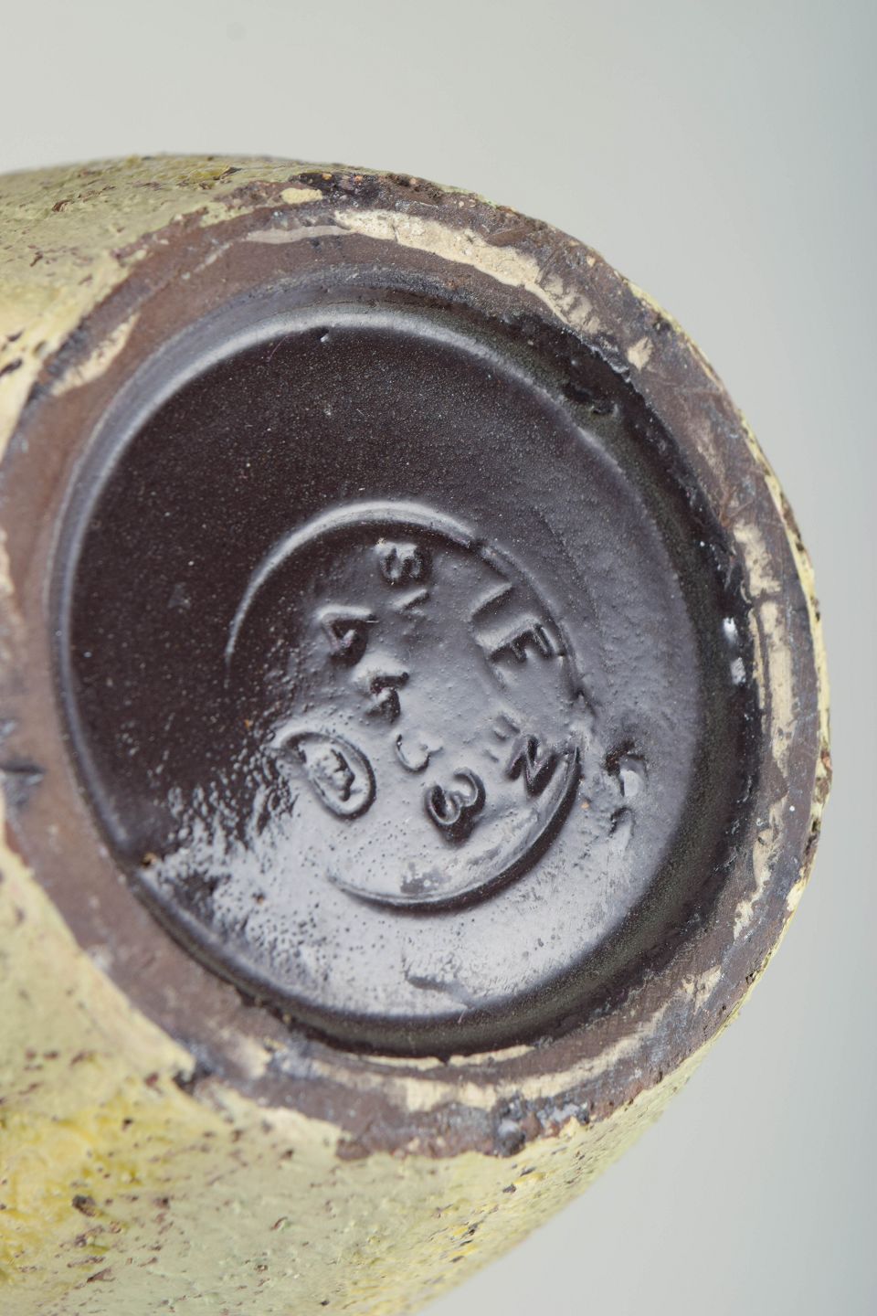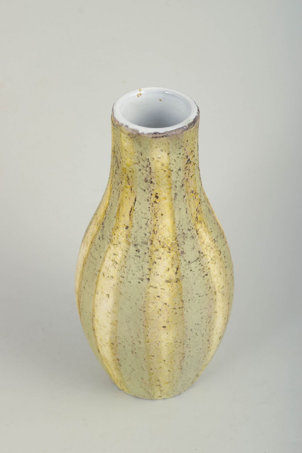 Organisk formet vase i glaseret keramik med smal hals og blødt buede sider. Dekoreret med lys gul glasur med mørke sprøjt og lodrette nuanceringer, der giver et levende, tekstureret udtryk. Modelnummer 4433.