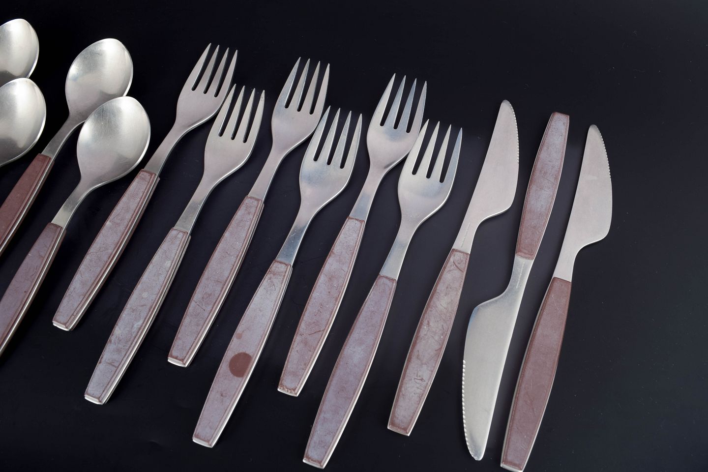 Komplet sæt bestående af seks middagsknive, seks middagsgafler og seks spiseskeer i rustfrit stål med brune håndtag. Modellen er fra Strata-serien.