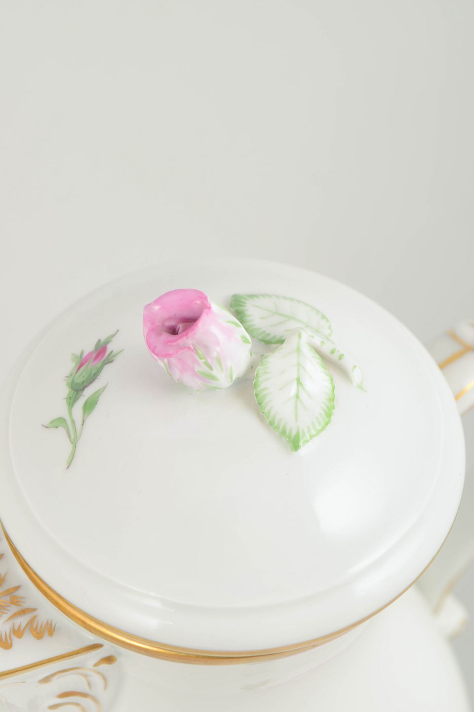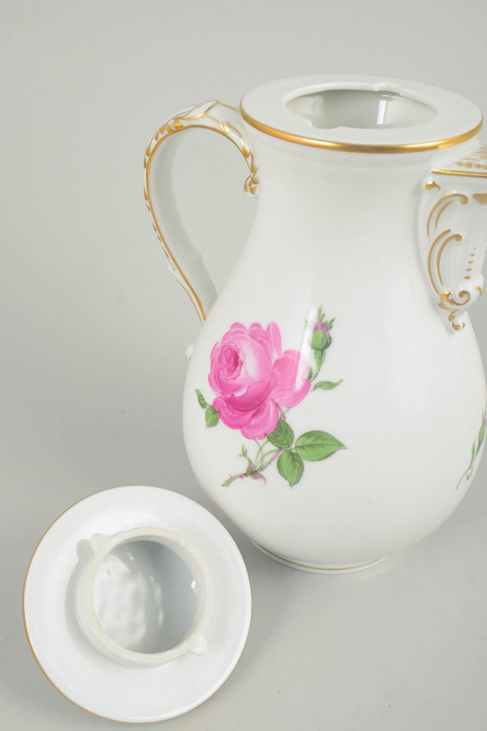 Kaffekande i hvidt porcelæn med håndmalet polykrom lyserød blomst fra serien Pink flower samt forgyldte kanter. Balusterformet korpus med svungen hank og knop på låget.