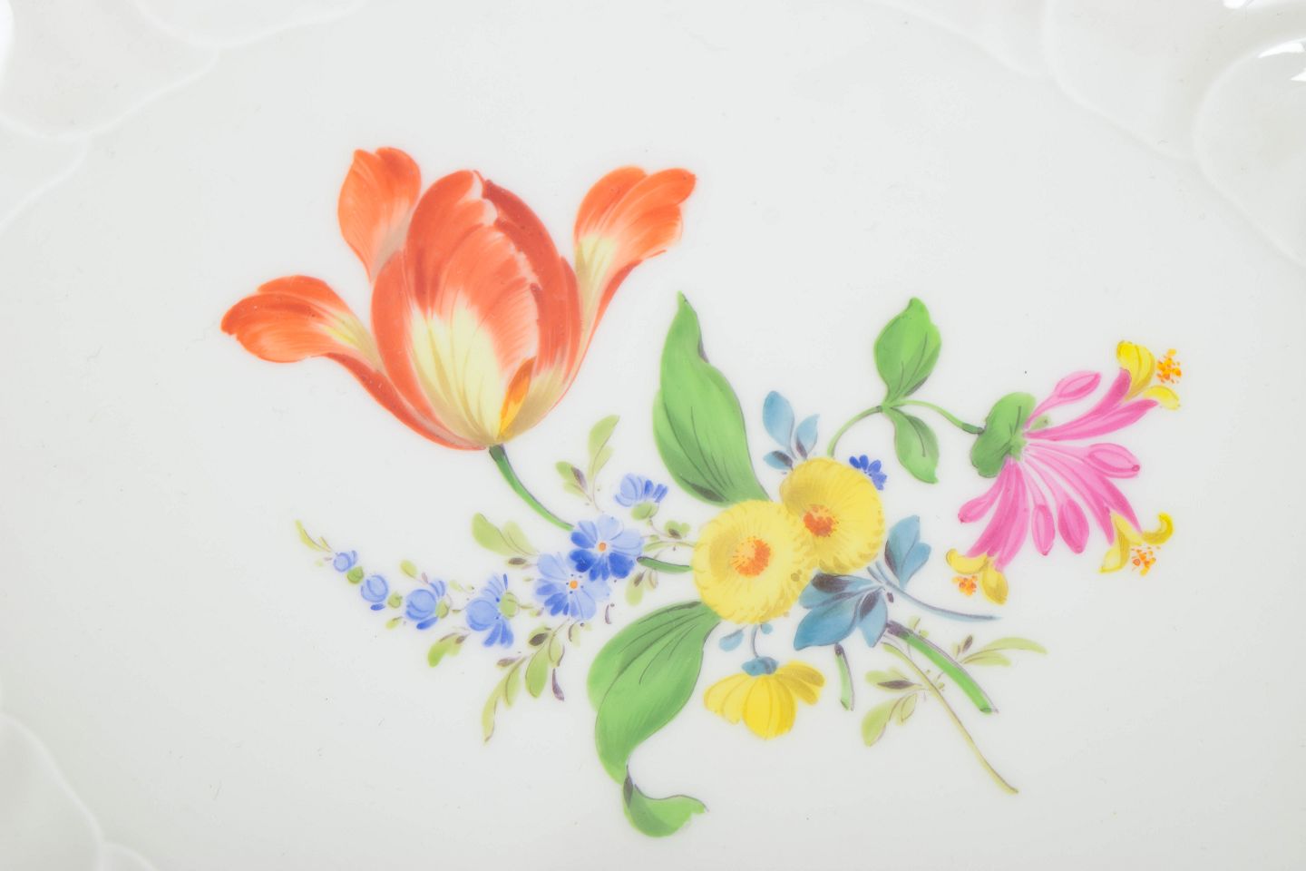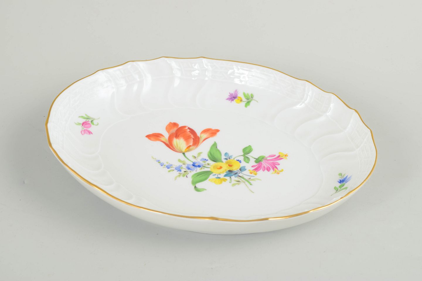Dekorationsfad i hvidt porcelæn med reliefkant og forgyldt rand. Hånddekoreret med polykrome blomsterbuketter fra serien Saksisk blomst.