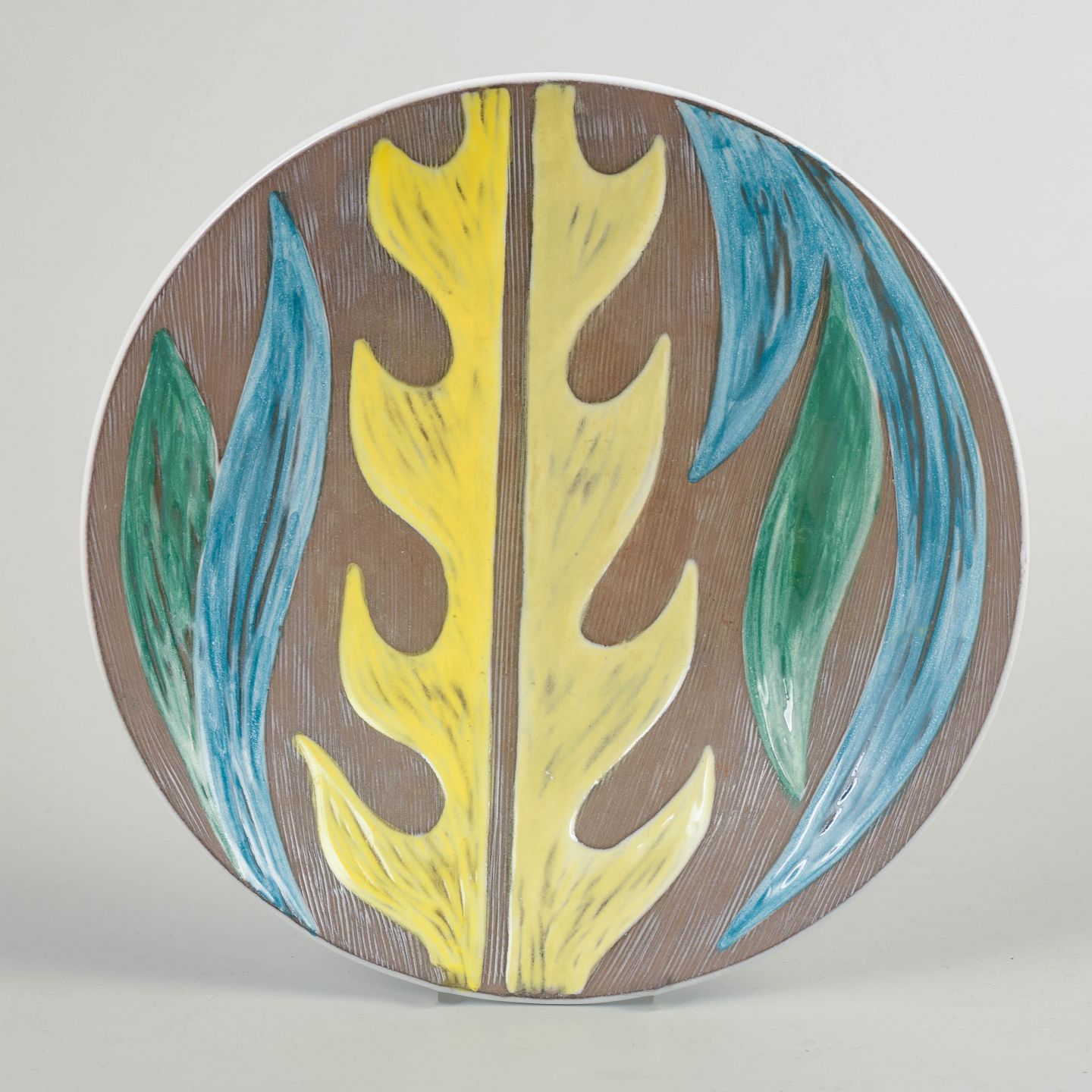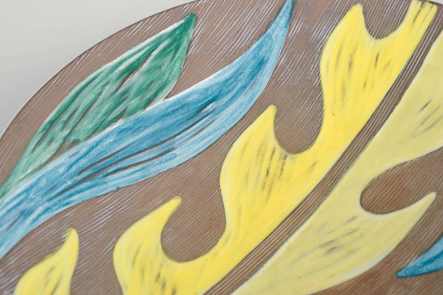 Dekorativ rund skål i glaseret fajance med stiliseret agaveblad-motiv i gule, blå og grønne nuancer mod en rillet, brun baggrund. Reliefdekorationen er typisk for Mari Simmulsons grafiske og naturinspirerede formsprog fra begyndelsen af 1960’erne. Modellen er nummer 4445 og dateret 1961.