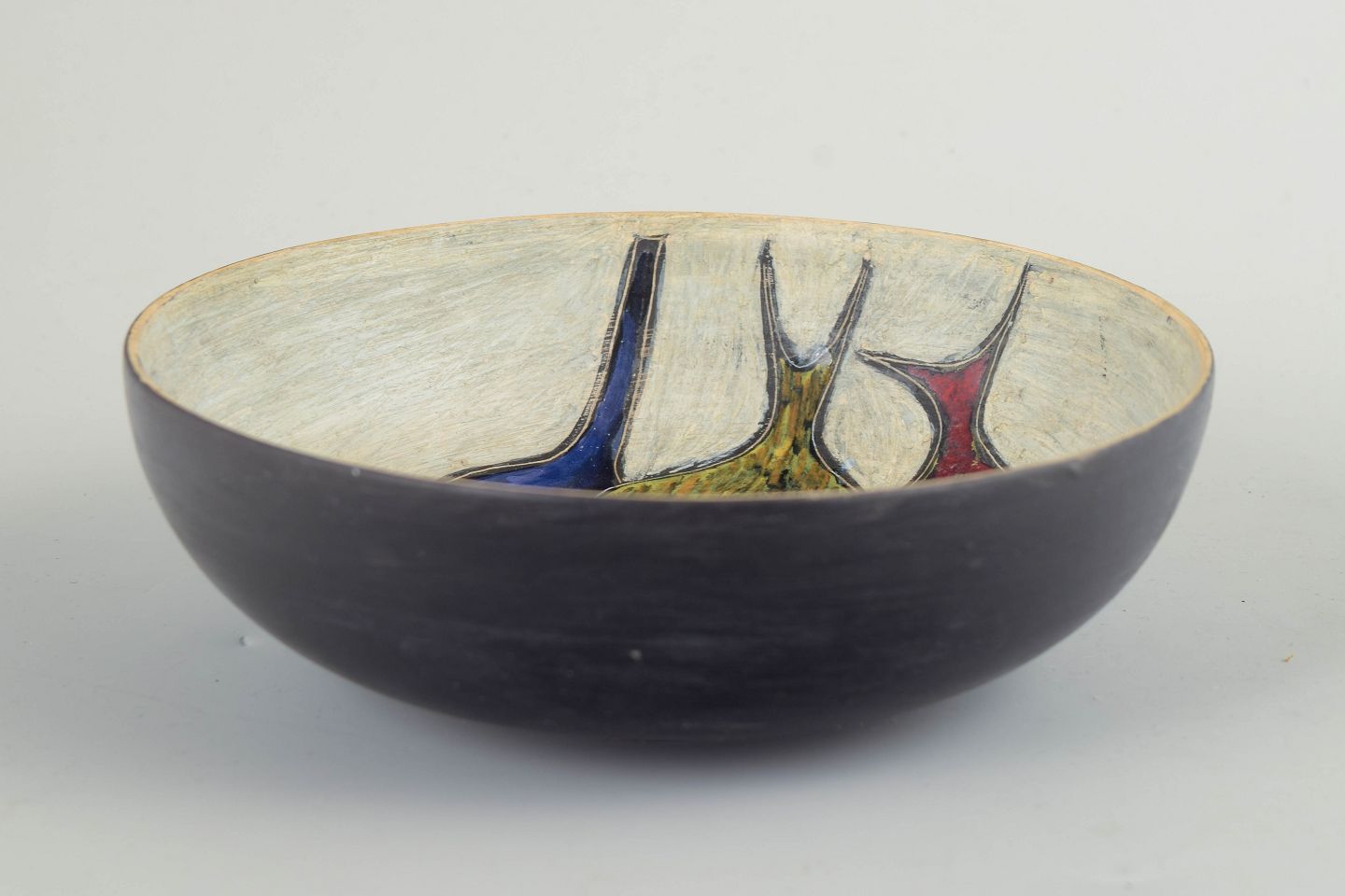 Lav, rund skål i glaseret keramik med abstraheret figurkomposition i relief, udført i dybe blå, grønne og røde toner mod lys bund. Kompositionen har et markant modernistisk udtryk med klare konturer og en malerisk glasurbehandling. Signeret på bunden “Fantoni, Italy”.