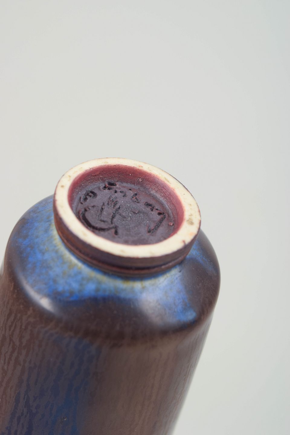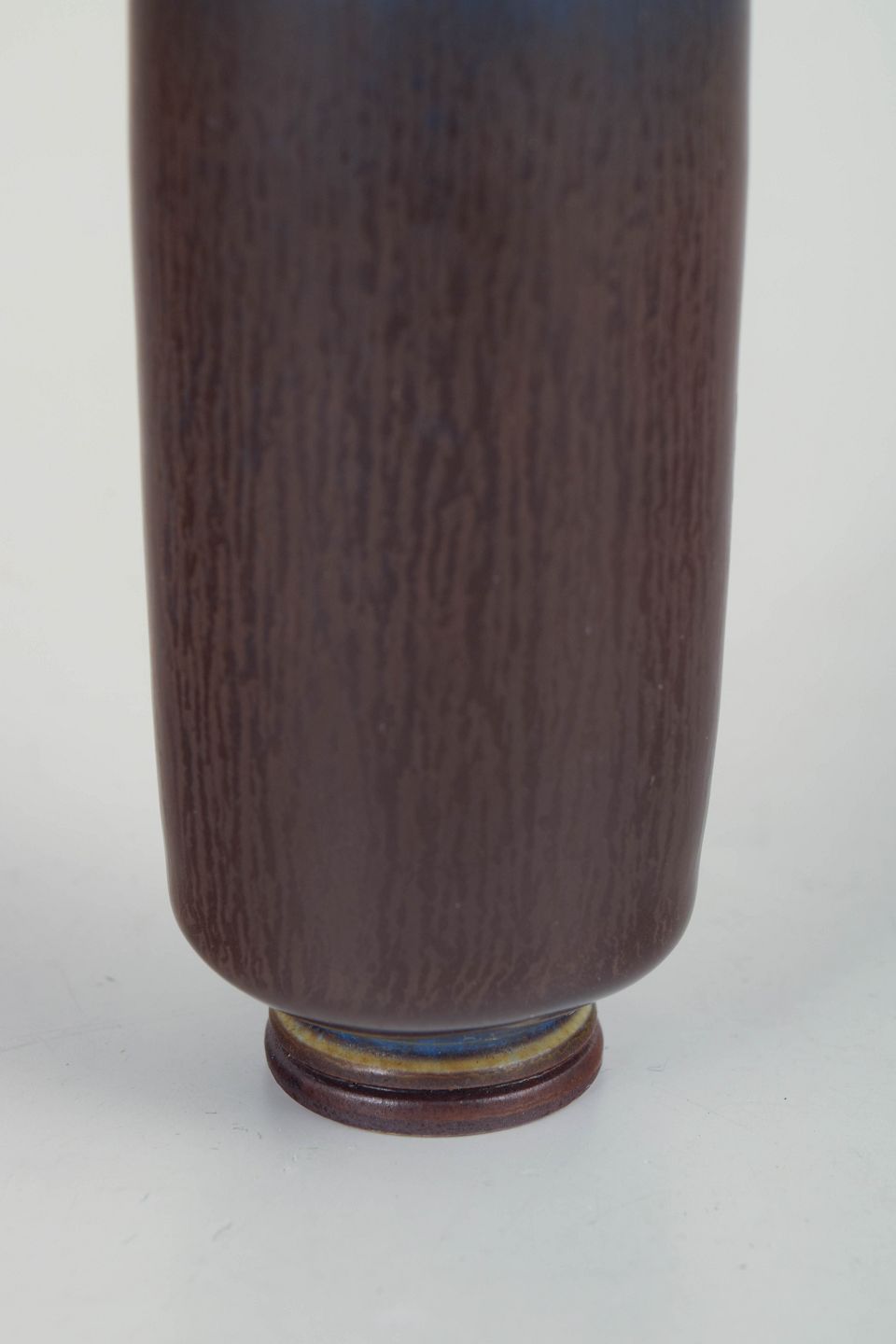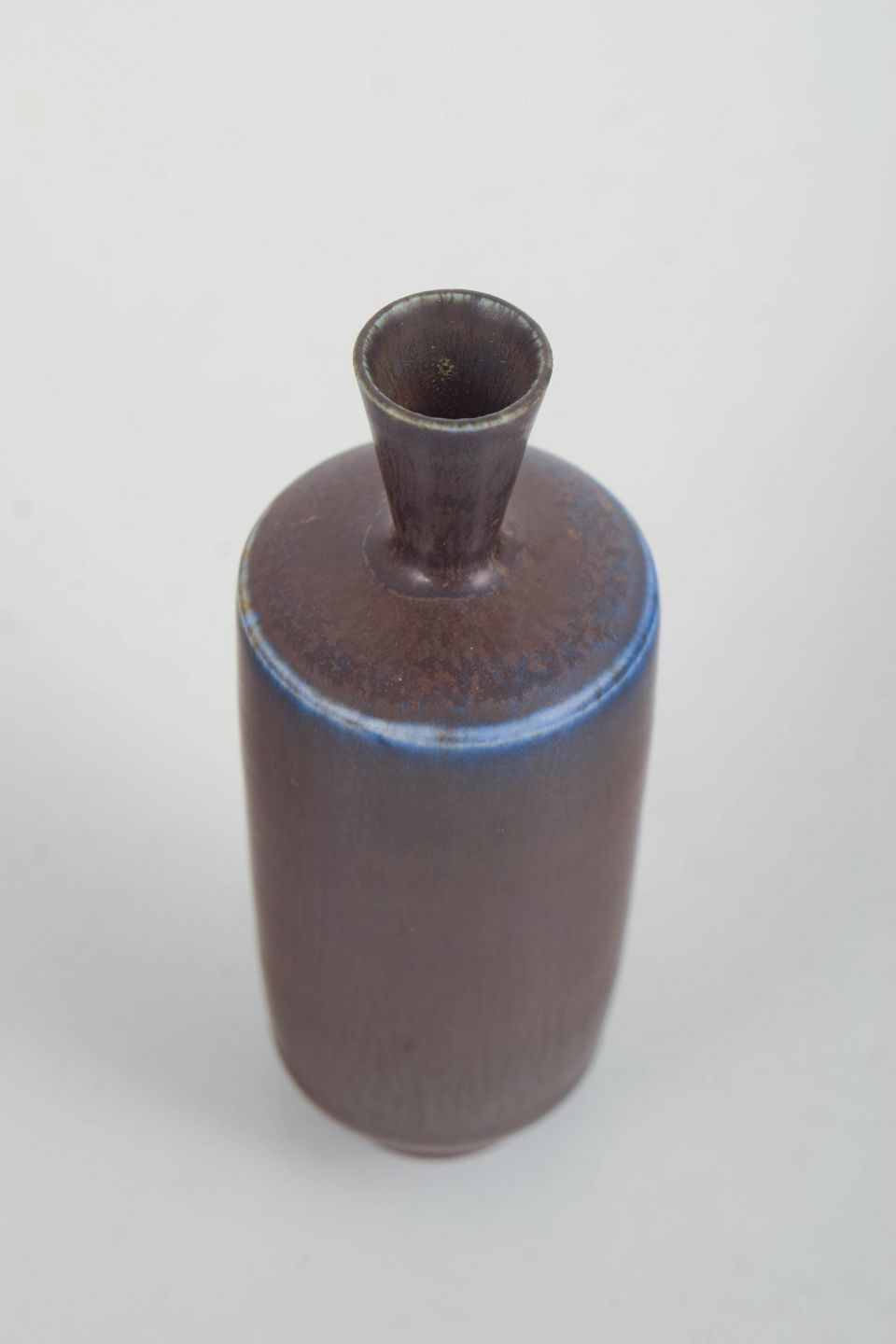 Miniature vase i stentøj med cylindrisk korpus og smal hals, udført som studiokeramik (studio hand). Glasuren er dyb brun med diskrete levende nuancer og en markant blålig overgang ved skulderen samt ringfod.