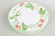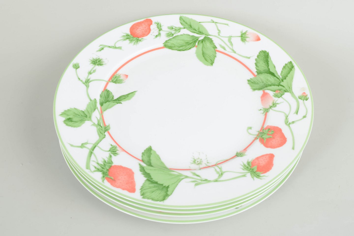 Sæt på fire store dækketallerkener i porcelæn med dekoration af jordbær og blade samt grøn og rød kant i serien Fraise.
