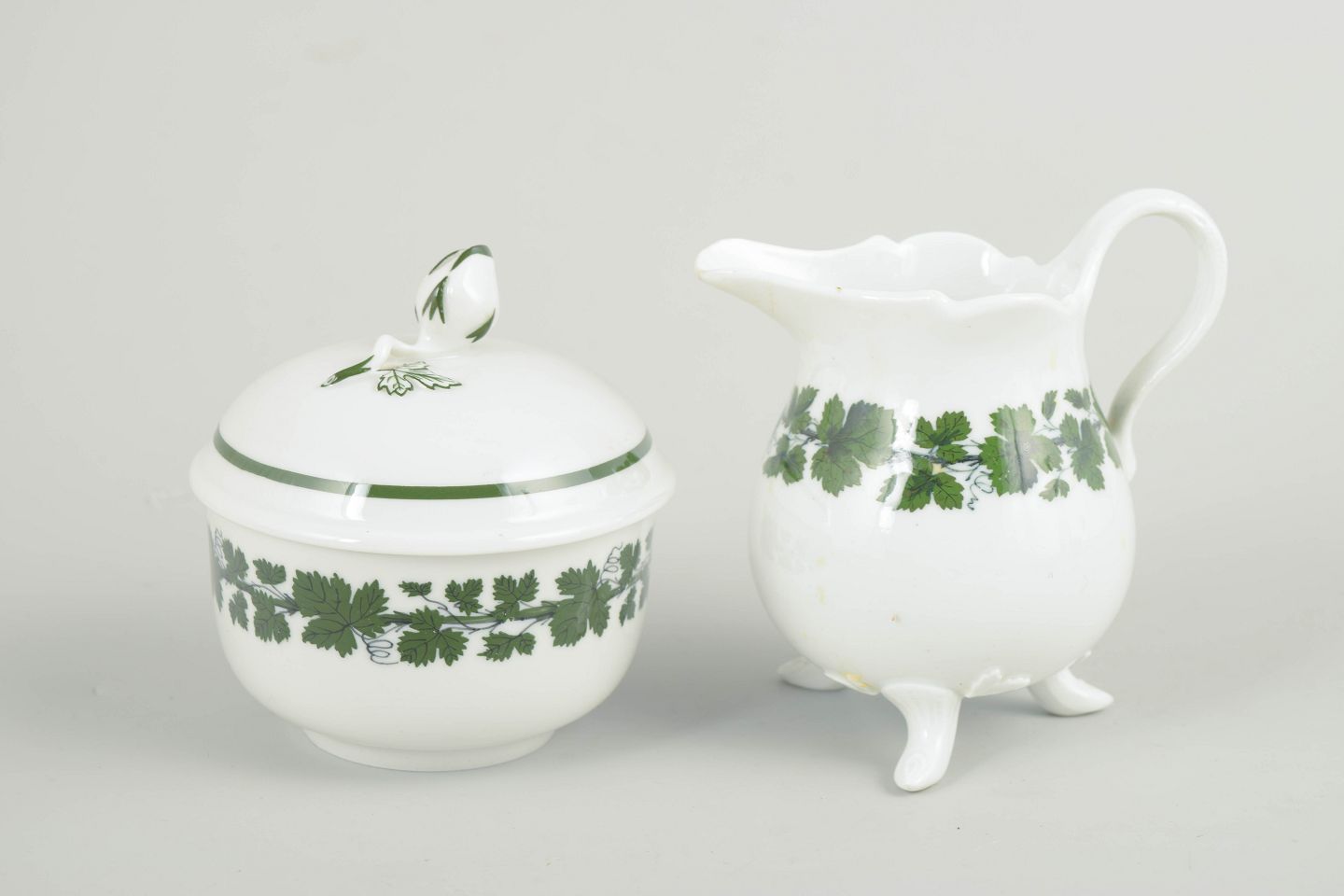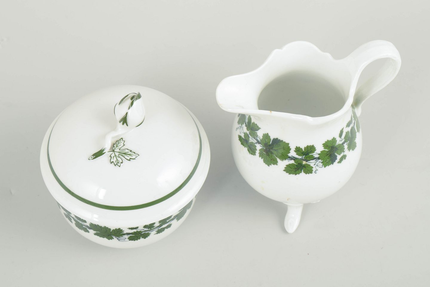 Porcelain sugar bowl with lid and creamer, decorated with a green vine and vine-leaf border; from the green vine leaf series.