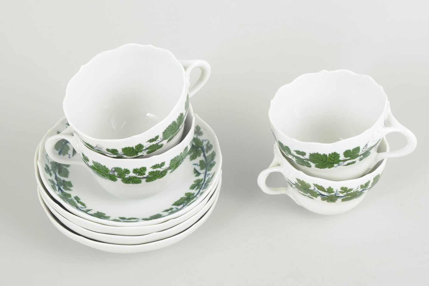 Porcelain coffee set comprising four cups and four saucers with a green vine and vine-leaf border; from the green vine leaf series.