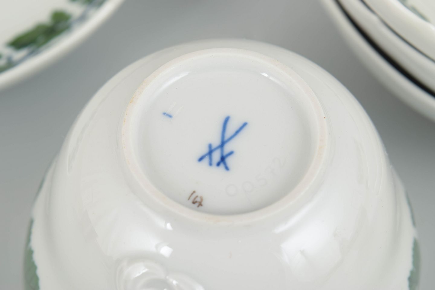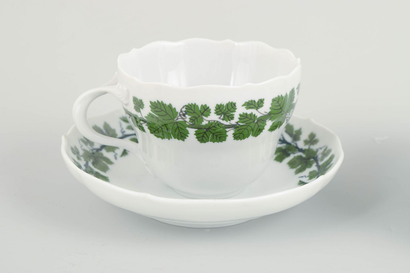 Meissen is Europe’s oldest porcelain manufactory, founded in 1710, and renowned for its high quality and hand-painted decoration. The green vine and leaf series is a classic table pattern, combining light botanical ornament with a clean and elegant porcelain form.