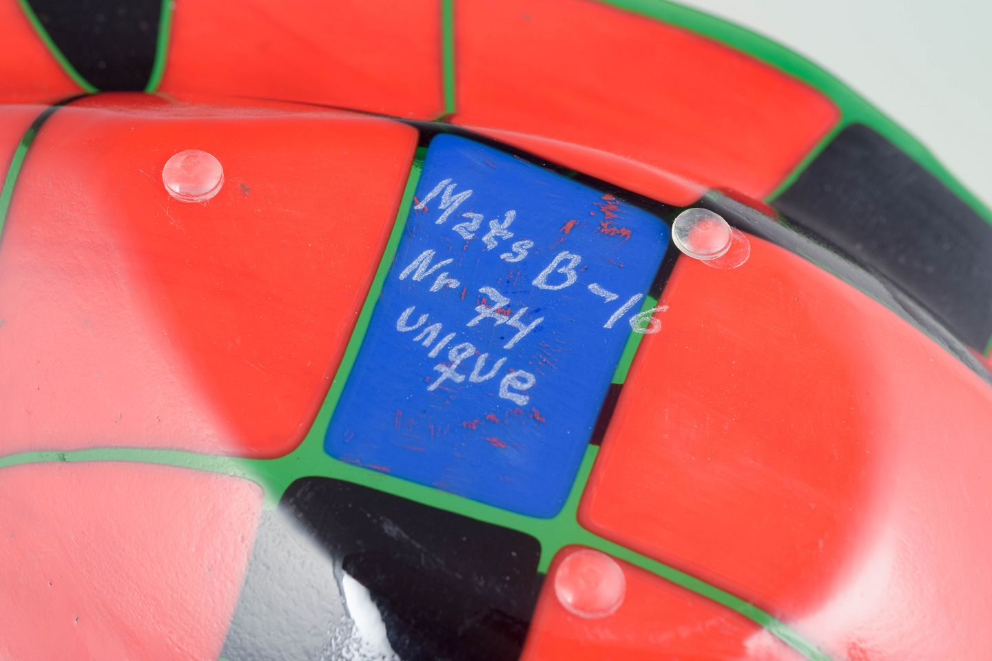 Organisk formet stykke kunstglas med geometrisk, mosaiklignende komposition i dybe farvetoner; udført som unika og nummereret.