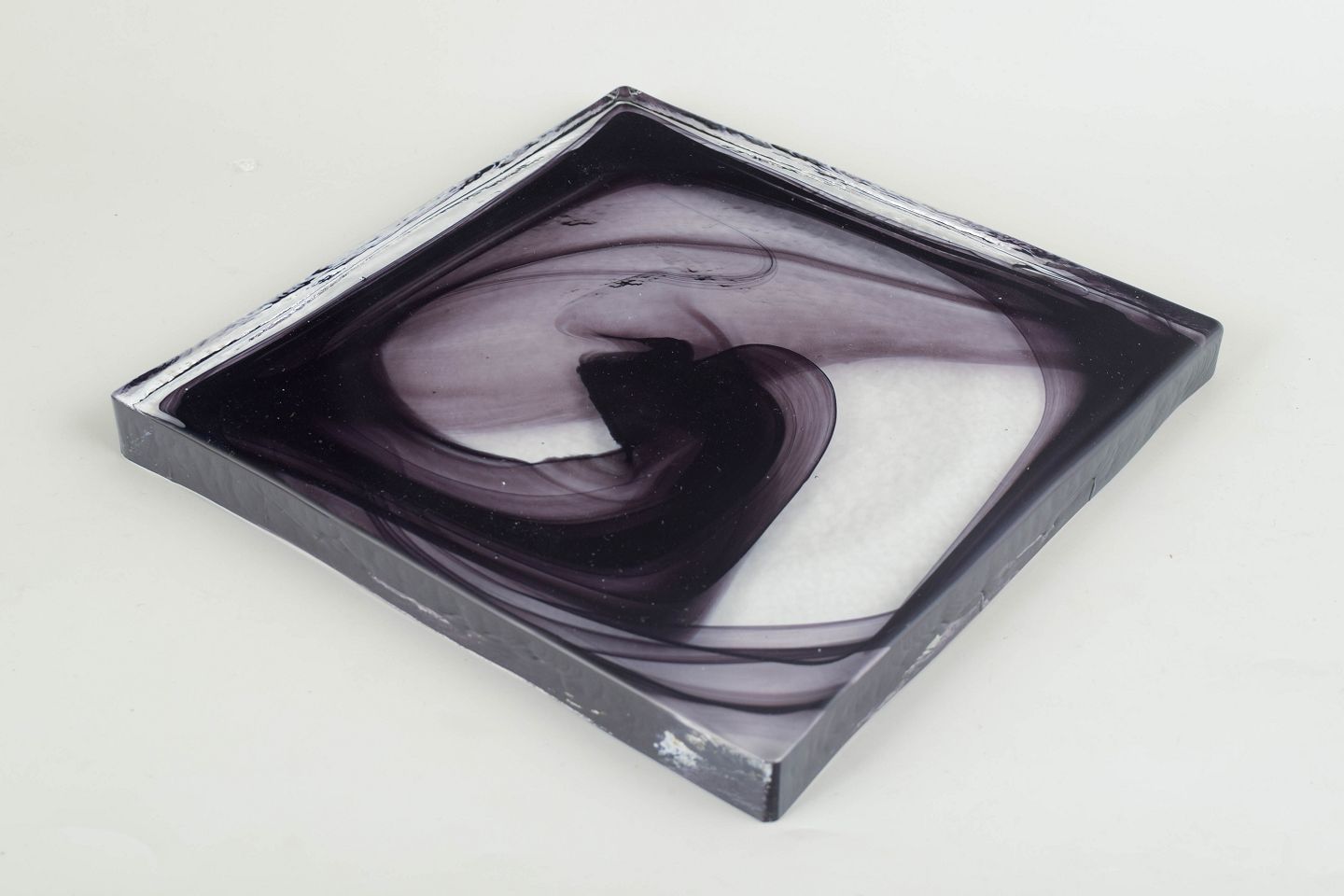 Fladt, kvadratisk objekt i klart glas med indkapslede, slyngede sorte og grå glastråde, der danner et abstrakt cirrus-lignende mønster. Modellen er kendt som Cirrus Black.