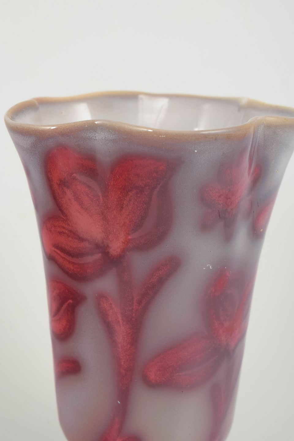 Dekorativ vase i glaseret keramik med blank luster-/metalglansglasur og reliefdekorerede blomster- og bladmotiver.