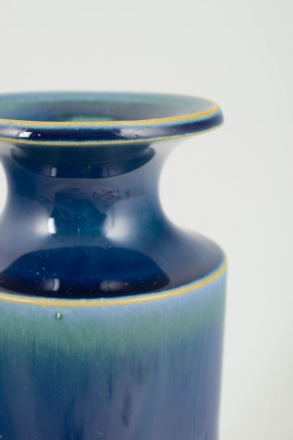 Cylinderformet vase i glaseret stentøj med dyb blå glasur og grønligt skær mod hals og kant; med Gustavsberg-mærke og etiket på undersiden.