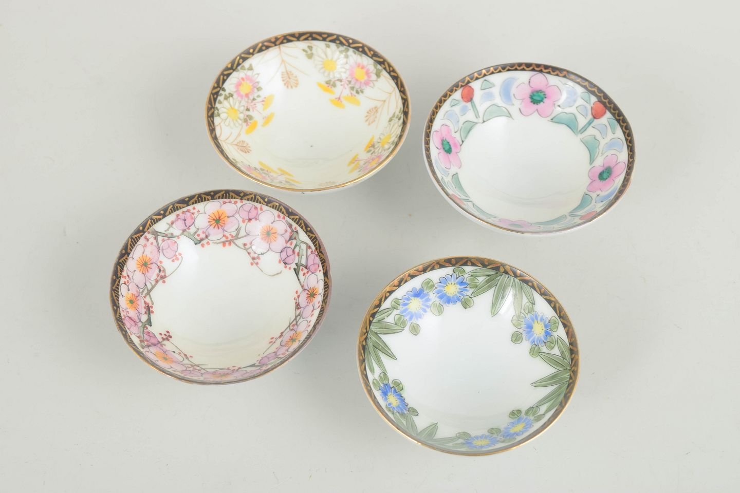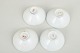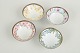 Sæt med fire små porcelænsskåle, hver med håndmalet dekoration i varierende motiver og farver, herunder blomster og stiliserede ornamenter. Skålene har underglasurblå og røde mærker under bunden.