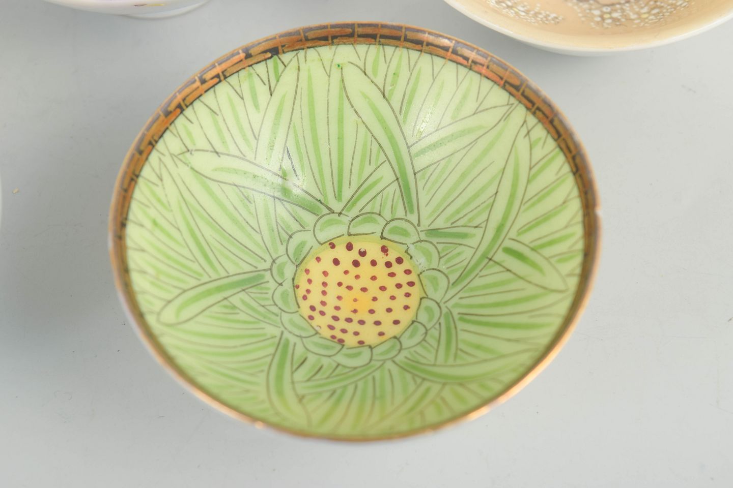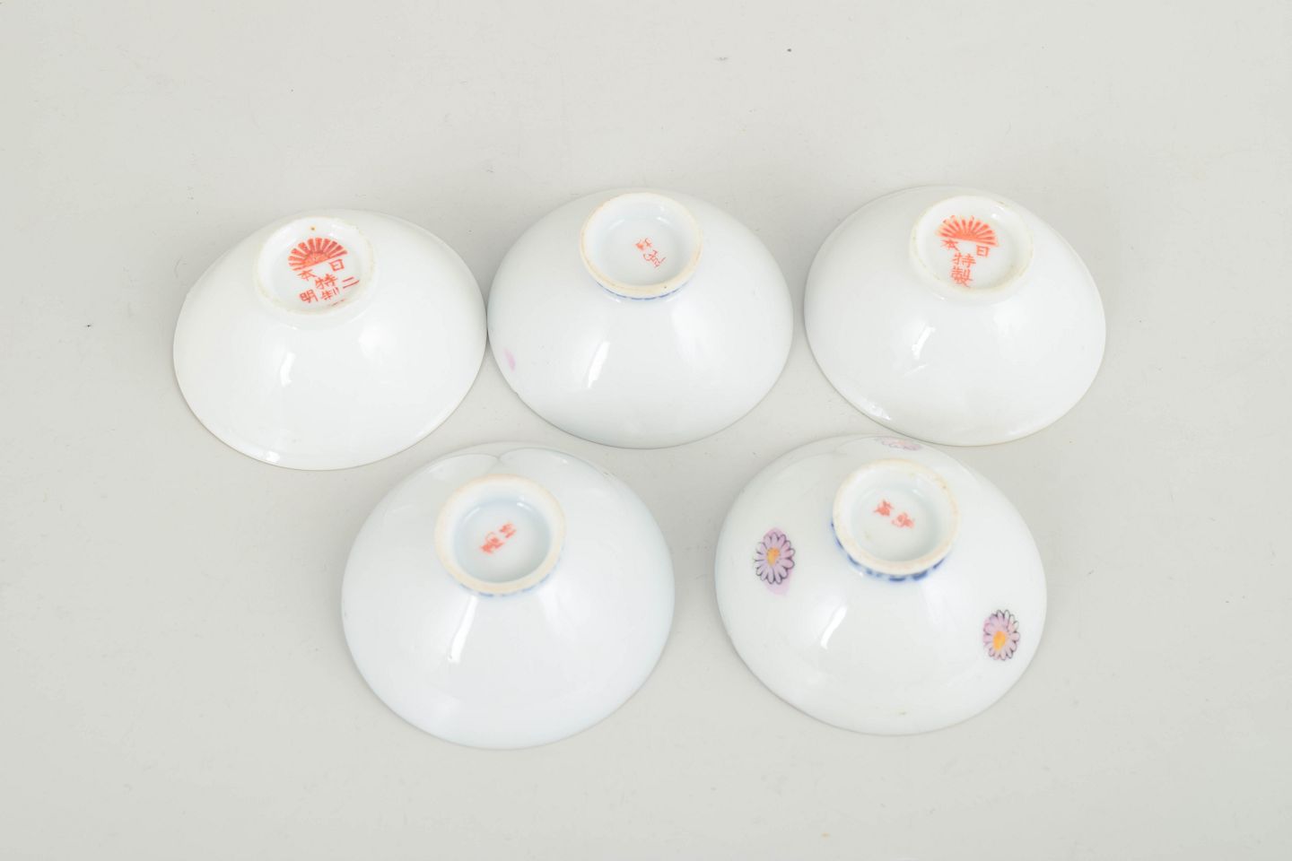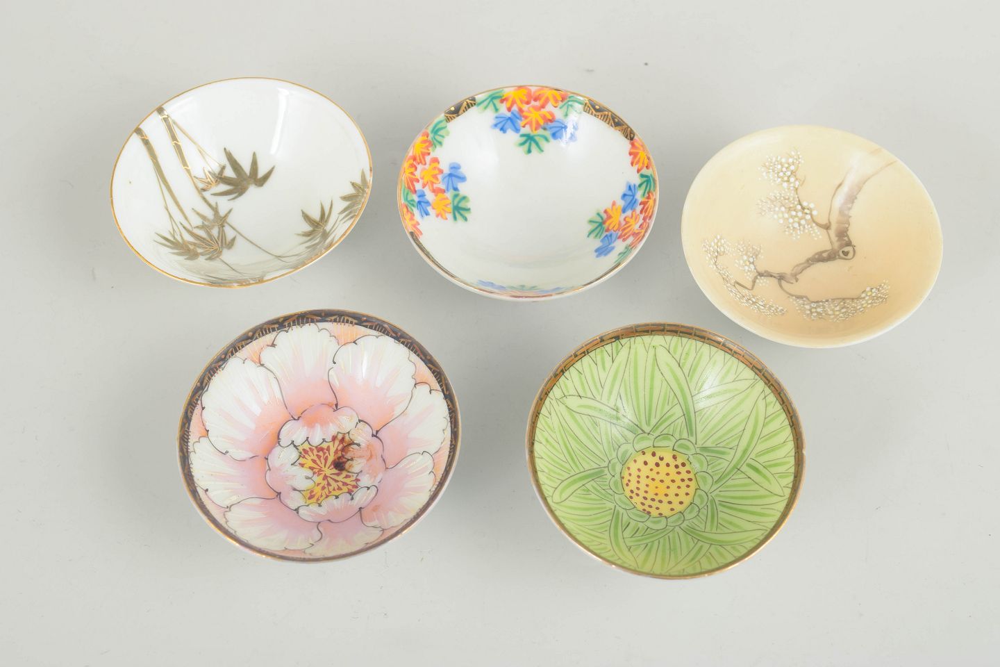 Sæt med fem små porcelænsskåle, hver med håndmalet dekoration i varierende motiver og farver, herunder blomster og abstrakte ornamenter. Skålene har underglasurblå og røde mærker under bunden.