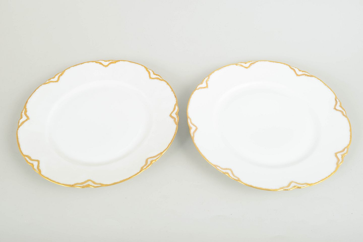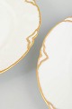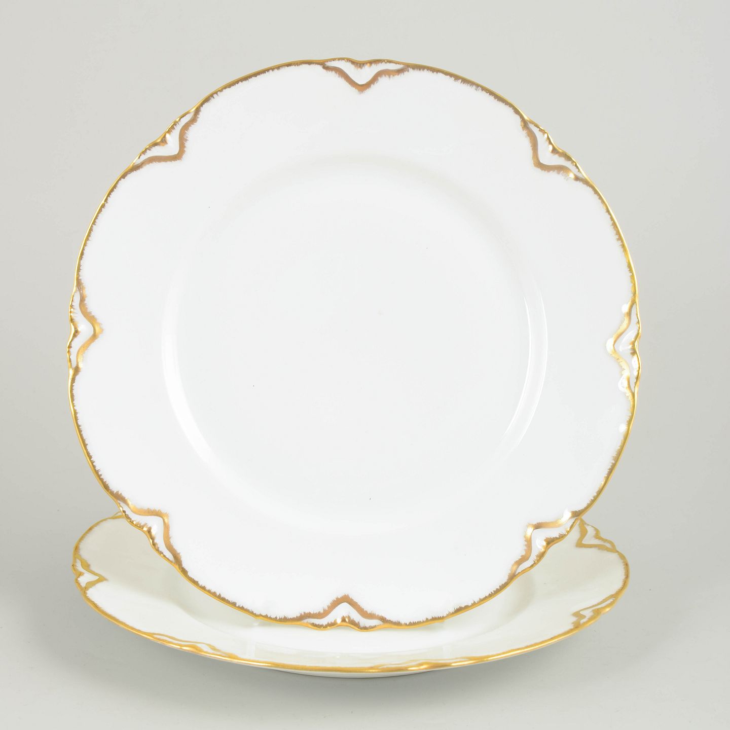 To franske middagstallerkener i hvid fajance med bølget fane og dekoration i forgyldt kant samt stiliserede, Art Deco-inspirerede gulddetaljer langs randen.