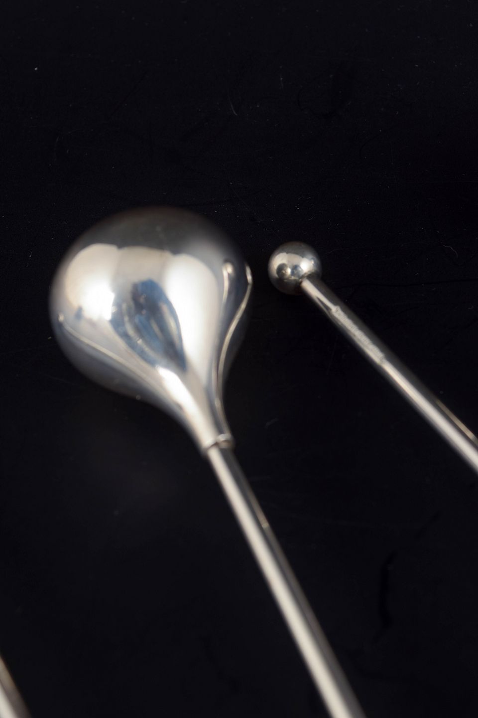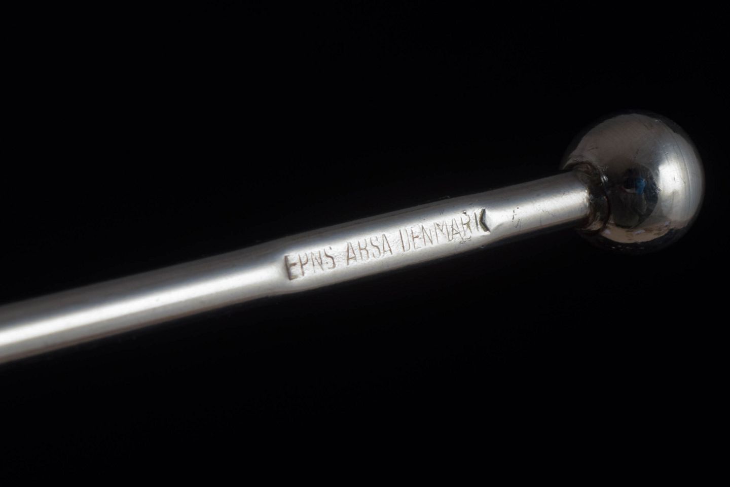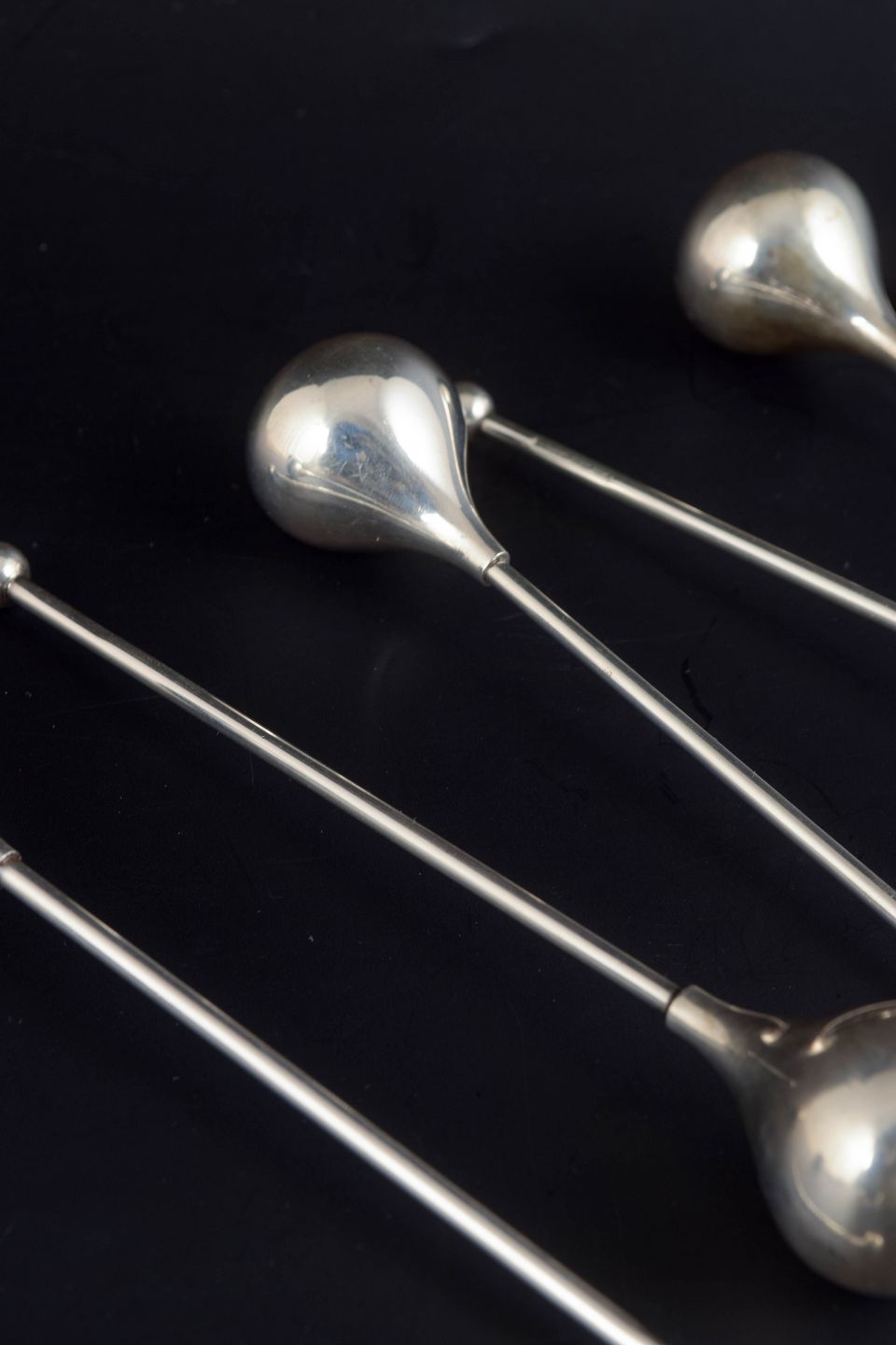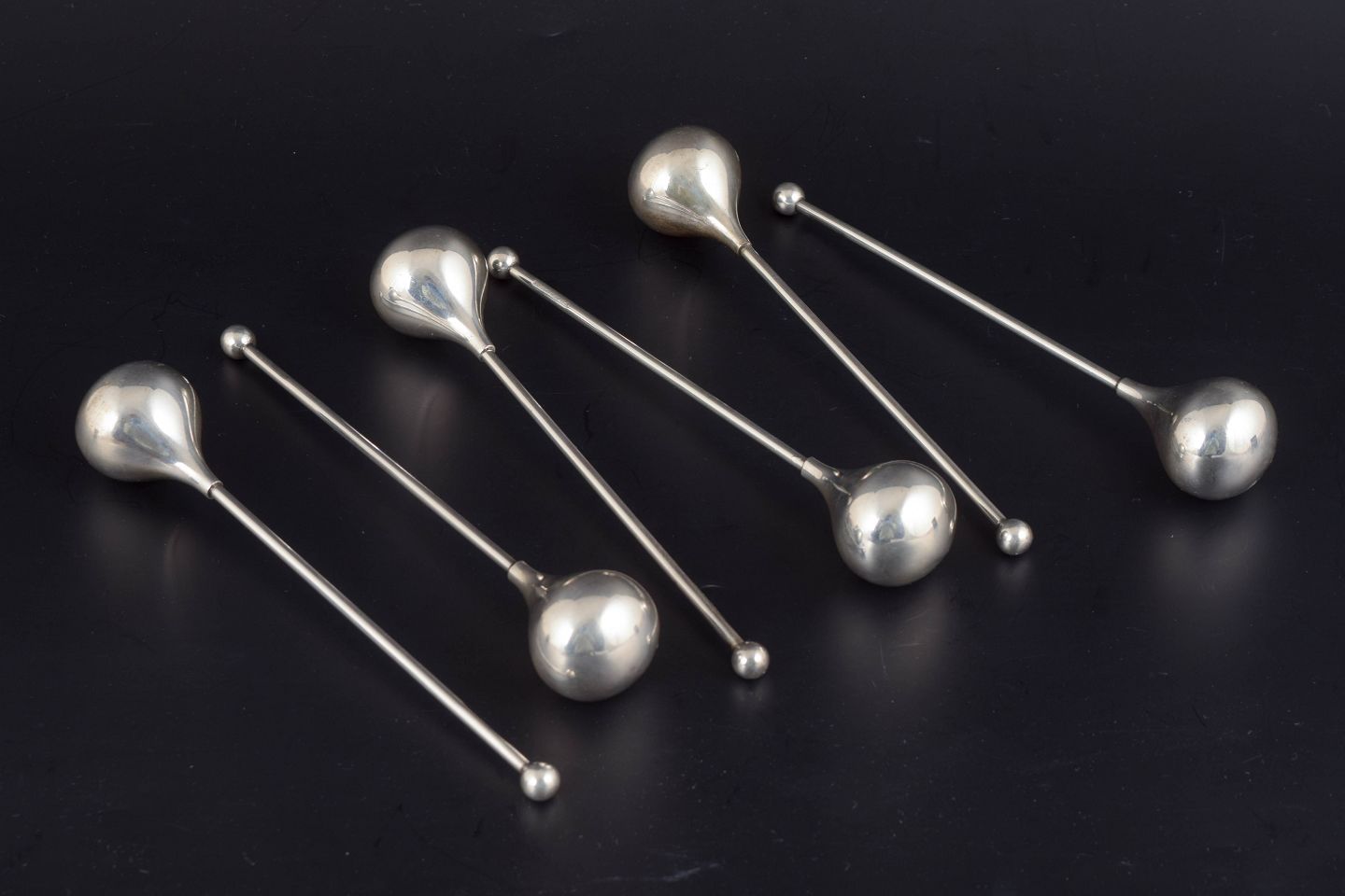 Sæt med seks slanke drinkkølere udført i forsølvet metal, udformet som stilrene stænger med afrundede ender. Stemplet “EPNS ABSA Denmark” på skaftet. Længde ca. 16 cm.