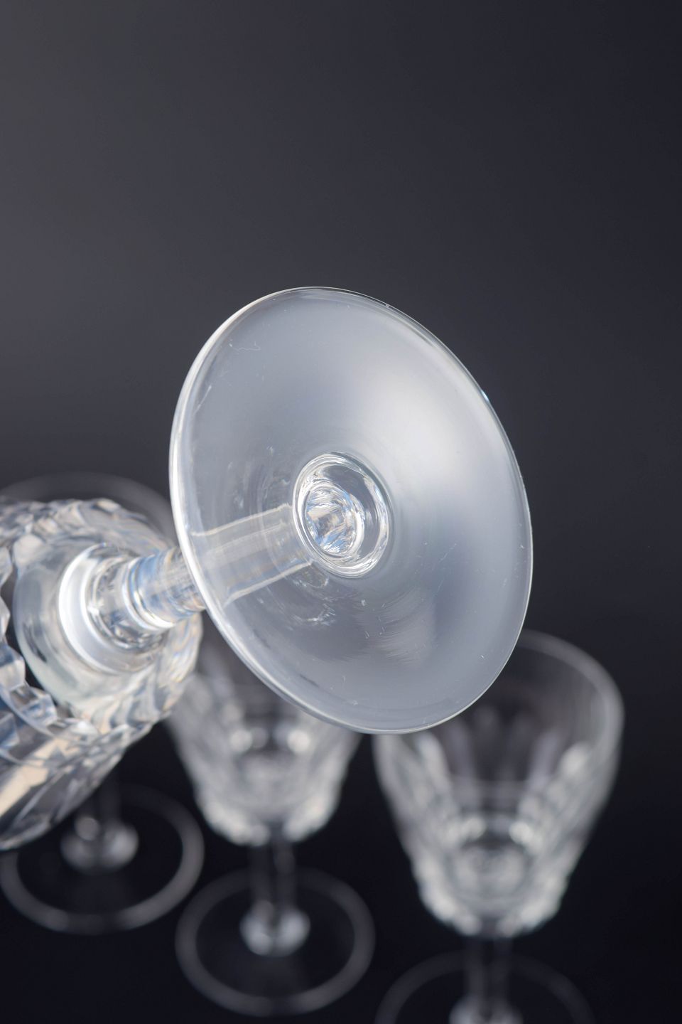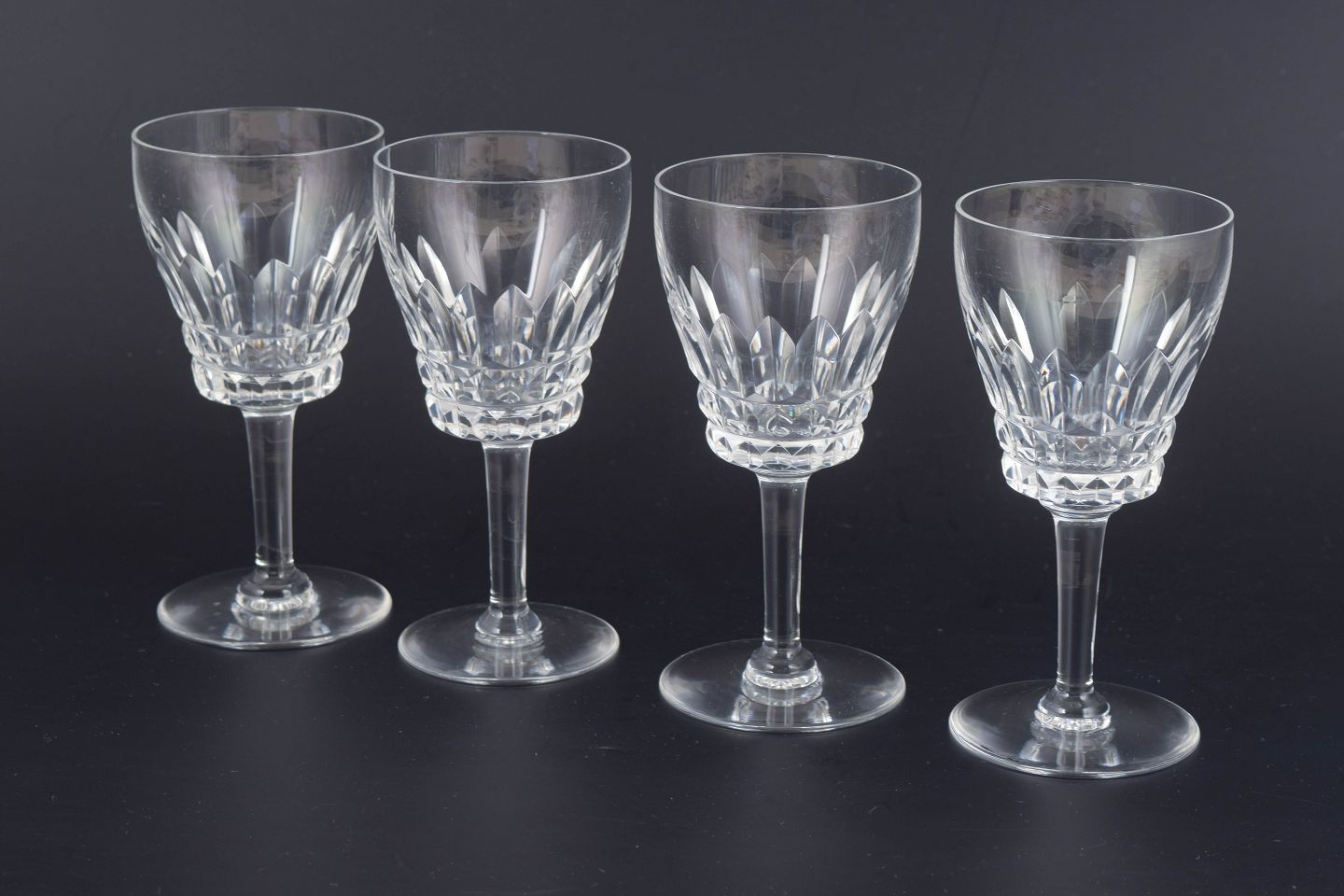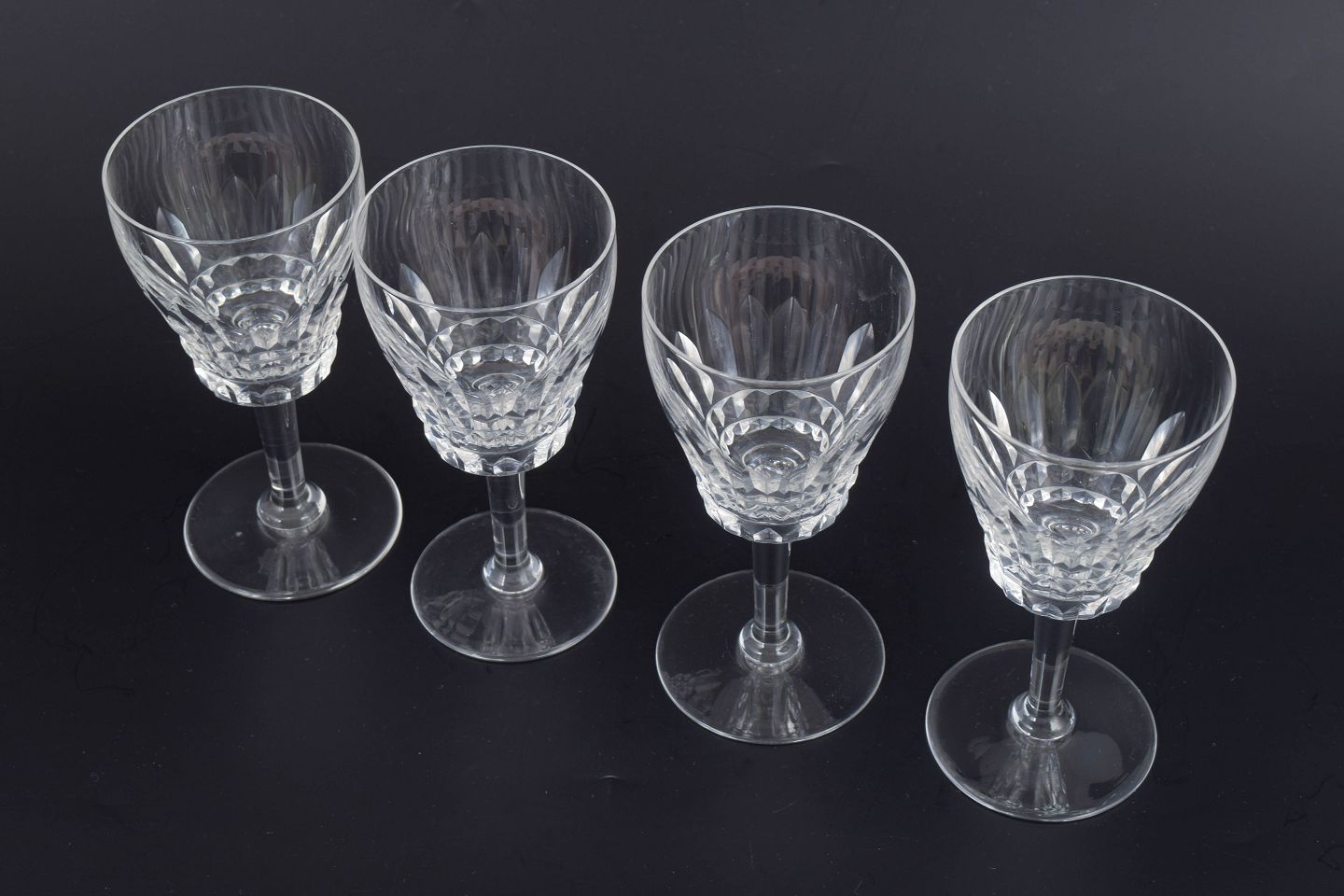 Sæt med fire franske hvidvinsglas i klart krystal med facetteret kumme og klassisk stamme. Form og slibning giver et elegant lysspil og et tidstypisk udtryk fra midten af det 20. århundrede.