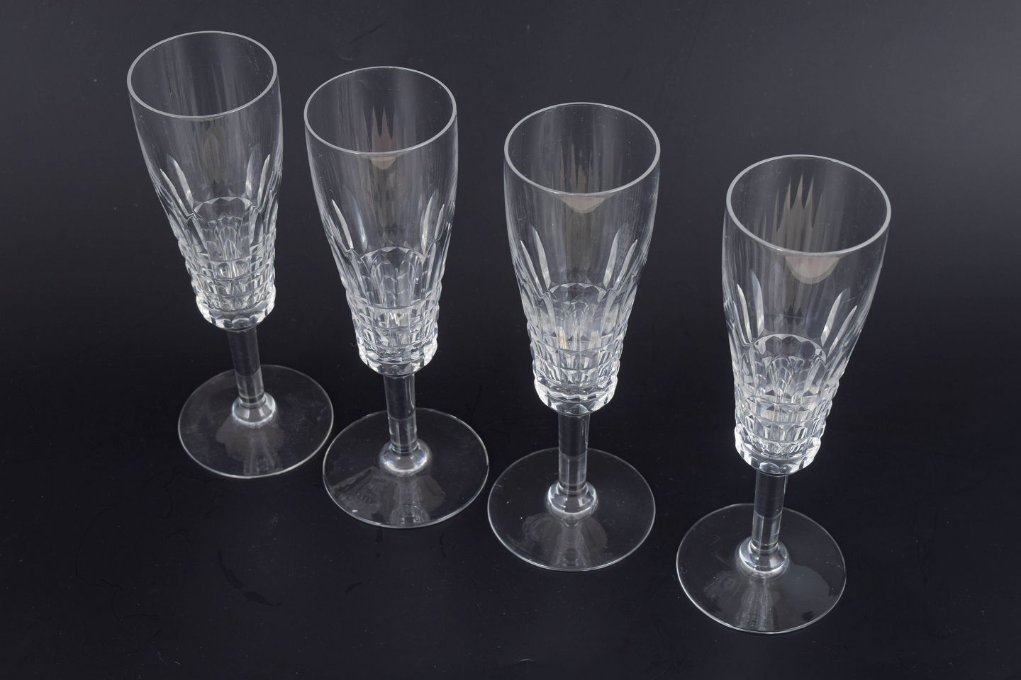 Sæt med fire franske champagneglas i klart krystal med facetteret kumme og klassisk stamme. Form og slibning giver et elegant lysspil og et tidstypisk udtryk fra midten af det 20. århundrede.