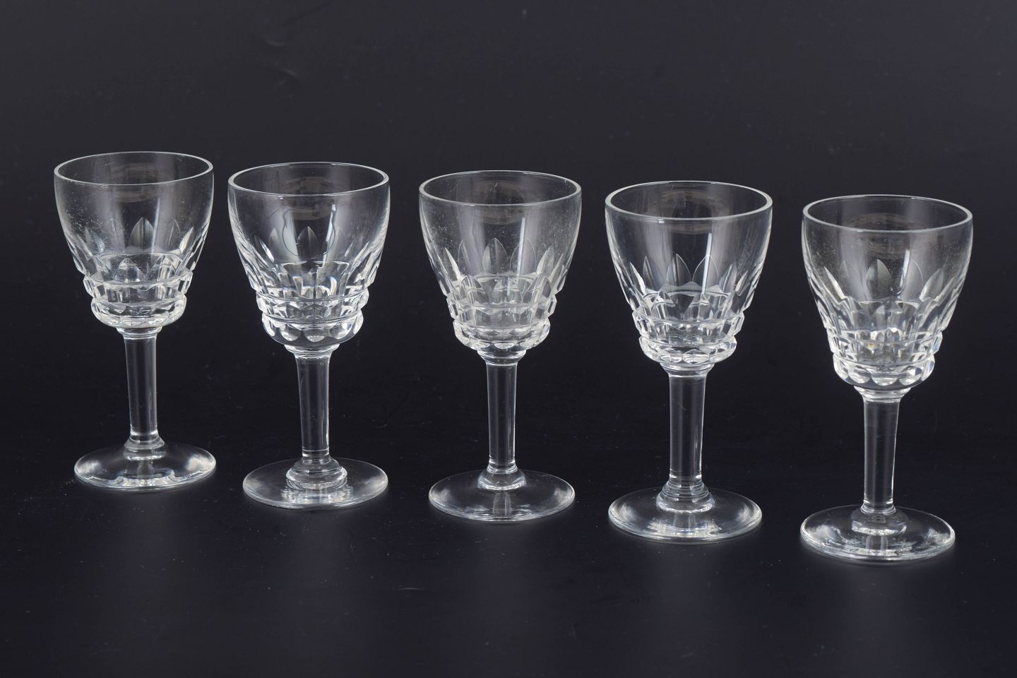 Sæt på fem franske snapseglas i klart krystal med facetteret kumme og klassisk stamme. Form og slibning giver et elegant lysspil og et tidstypisk udtryk fra midten af det 20. århundrede.