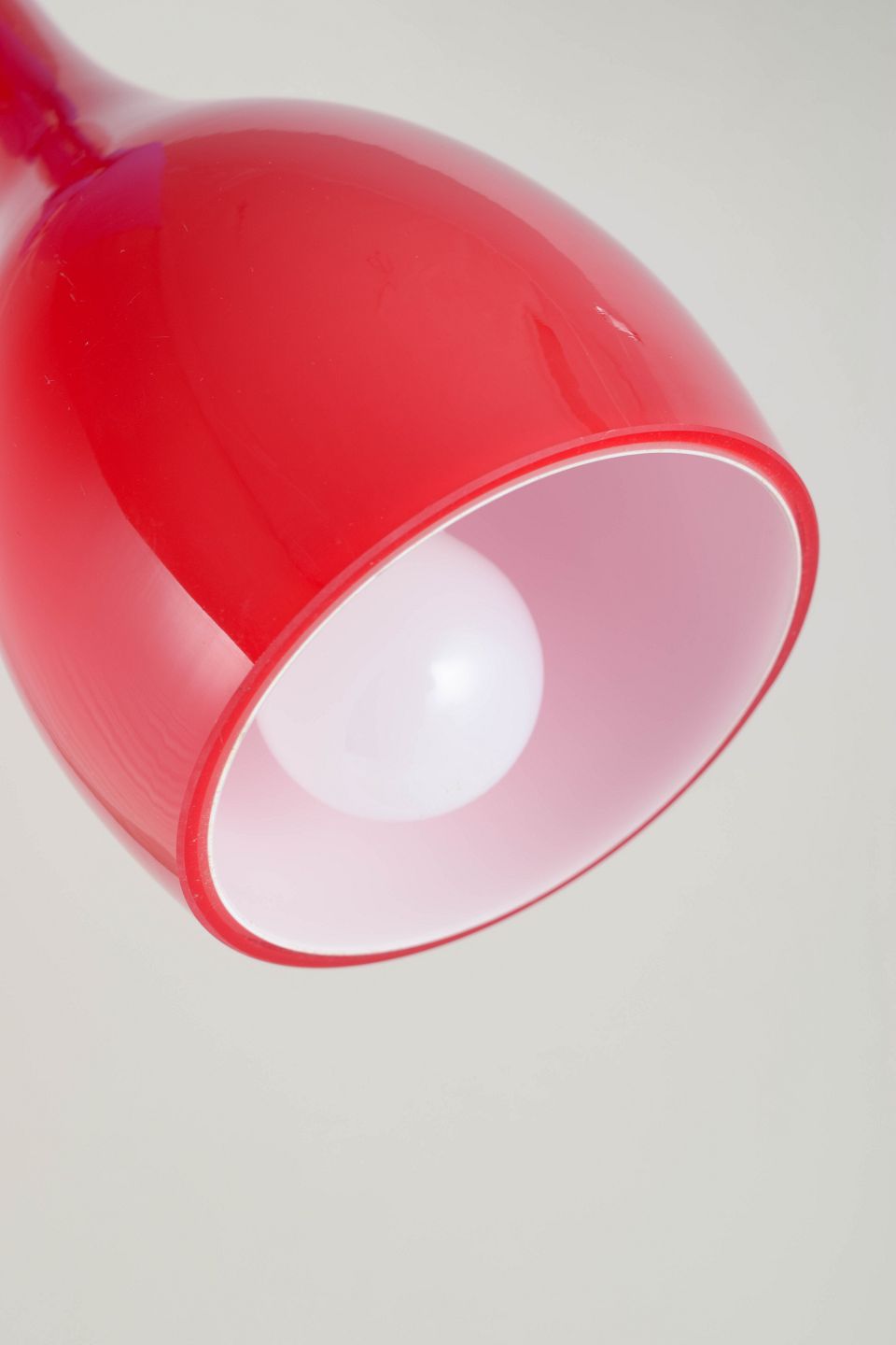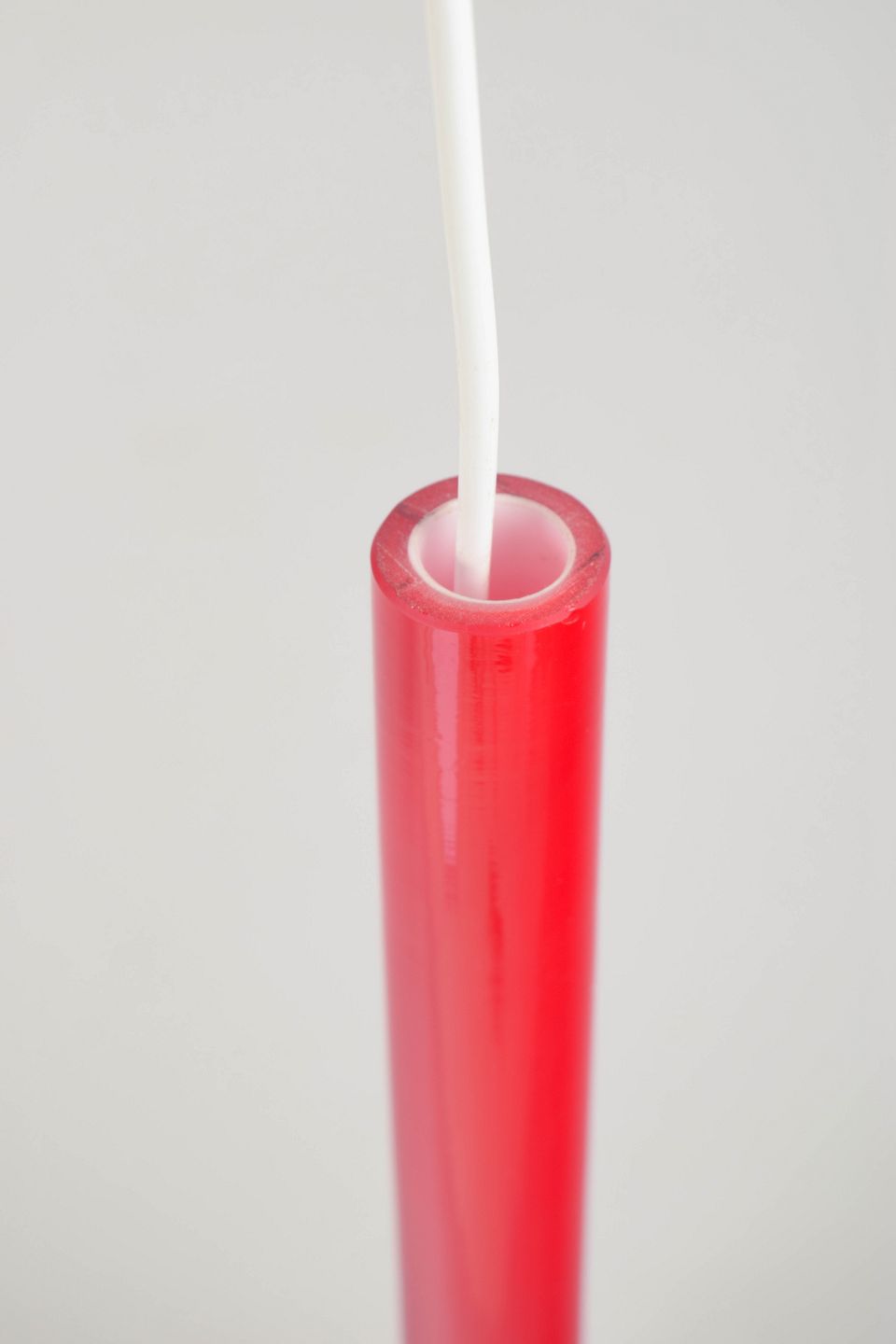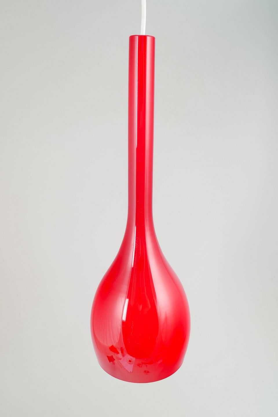 Dråbeformet pendel i blankt rødt kunstglas med lang, slank hals og blødt afrundet korpus, udført i mundblæst glas.