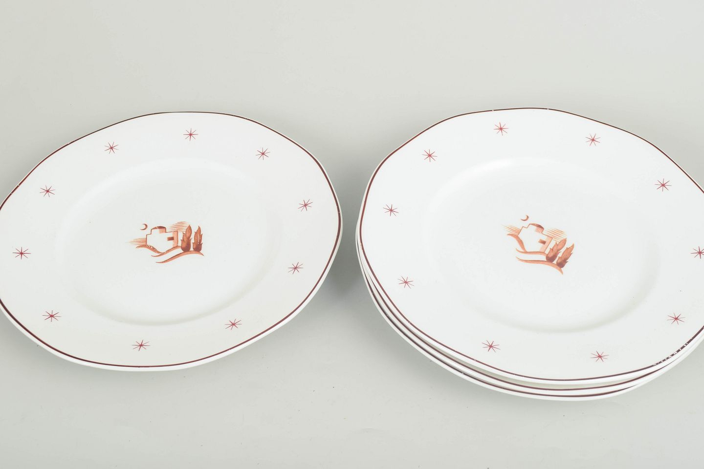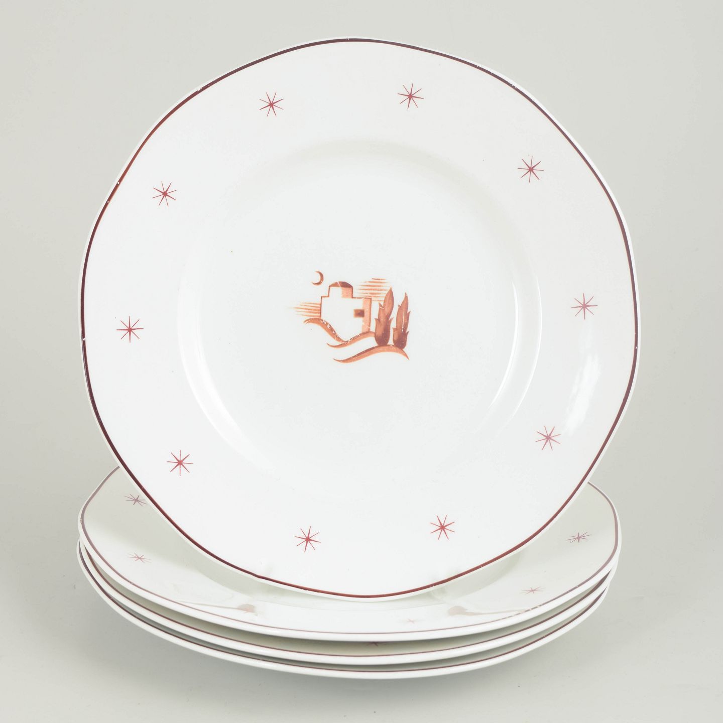 Middagstallerkener i glaseret fajance med let bølget fane, brun kantstreg og stjernemotiver samt centralt orientalsk landskabsmotiv. Model Orient.