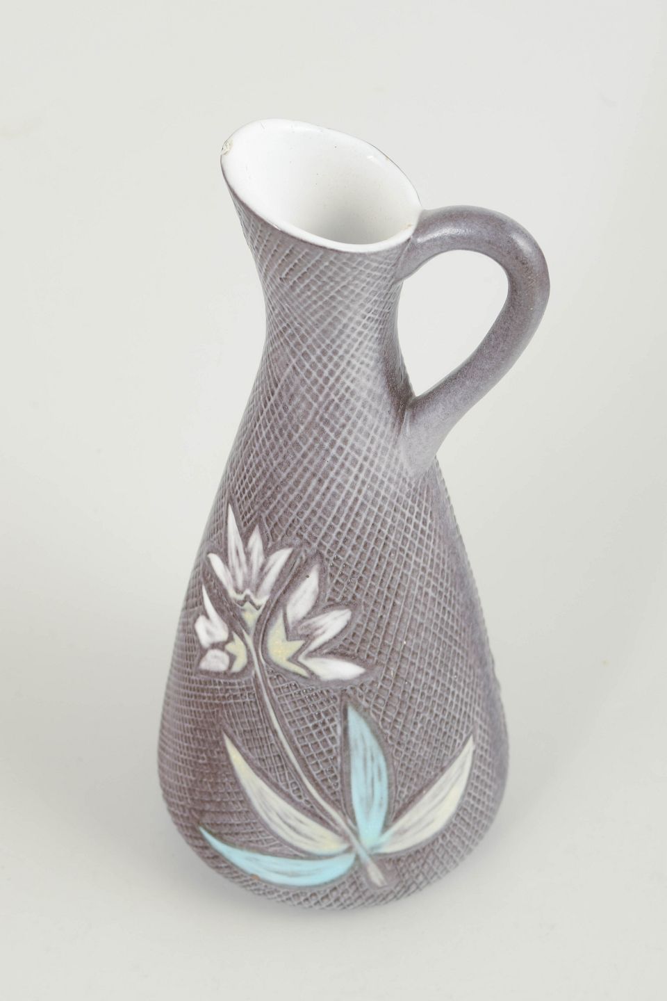 Elegant kande i stentøj med gråviolet, fint tekstureret overflade og reliefdekoration med stiliserede blade i lyse turkise og hvide toner. Organisk, slank form med integreret hank. Modellen er stemplet i bunden og bærer modelnummer 4499.