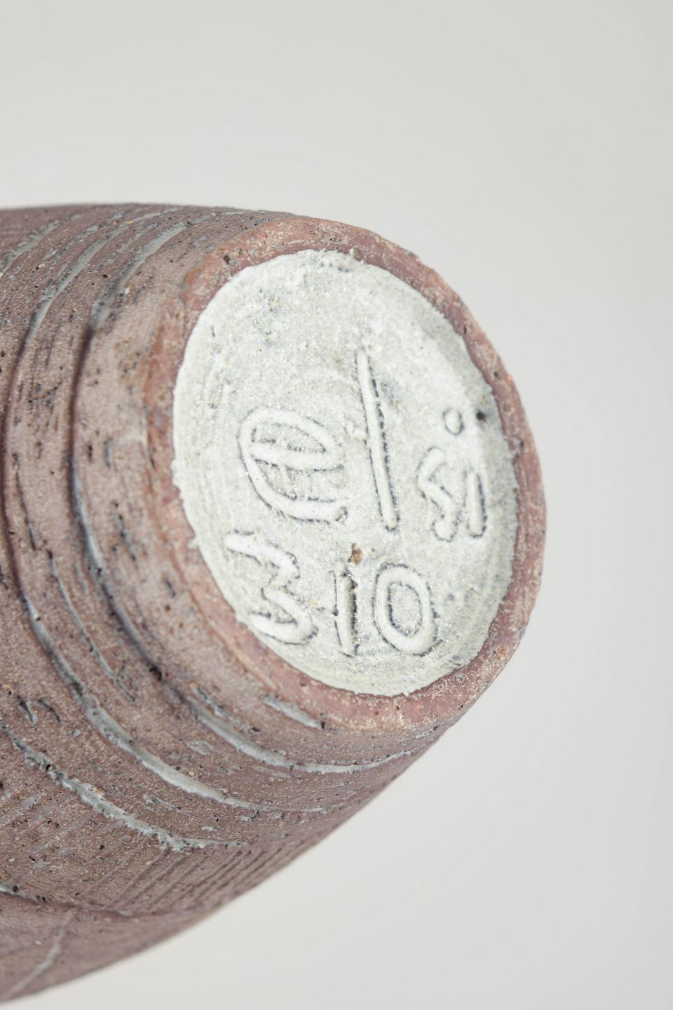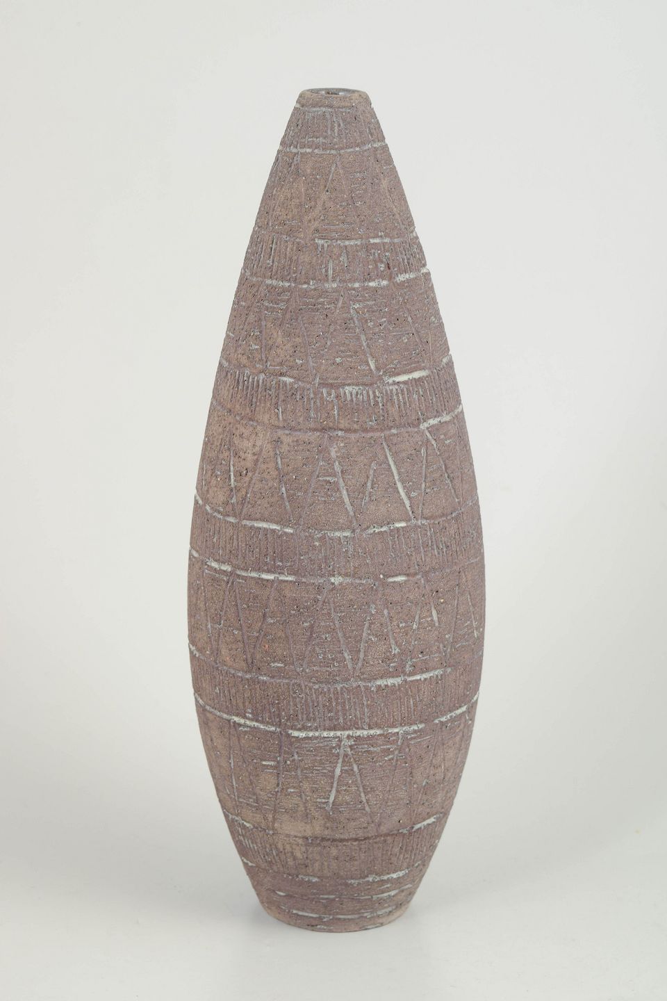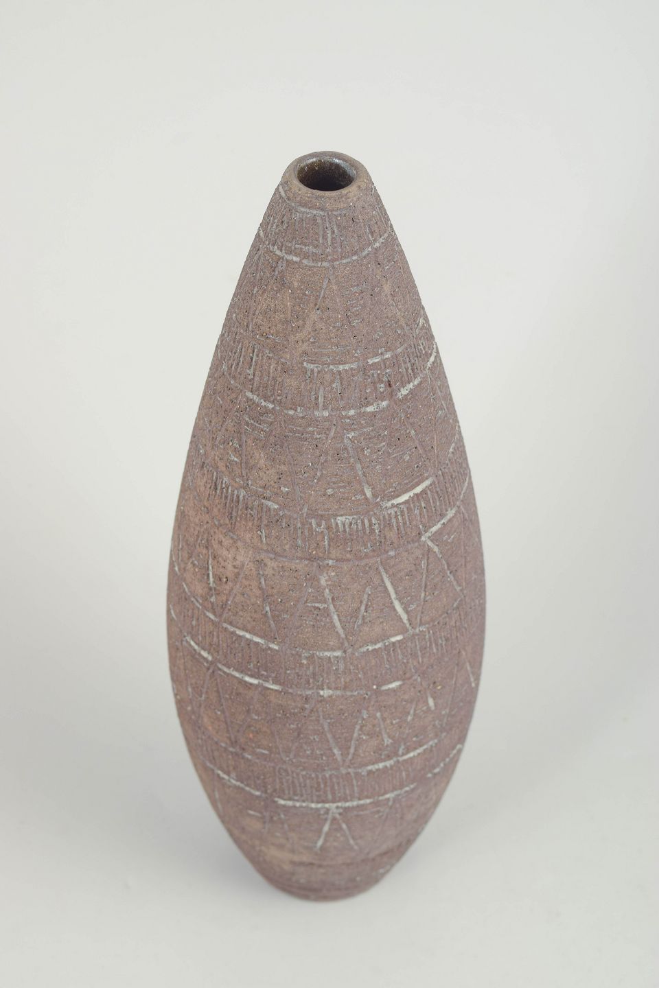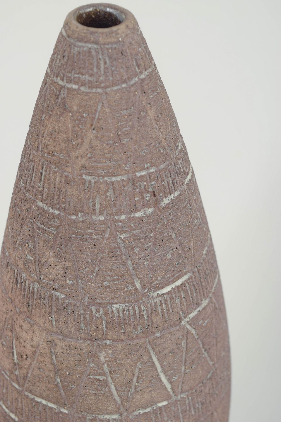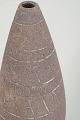 Slank konisk vase i drejet stentøj med rå, mat overflade og indridset geometrisk dekoration. Stemplet mærkning i bunden angiver model 310.