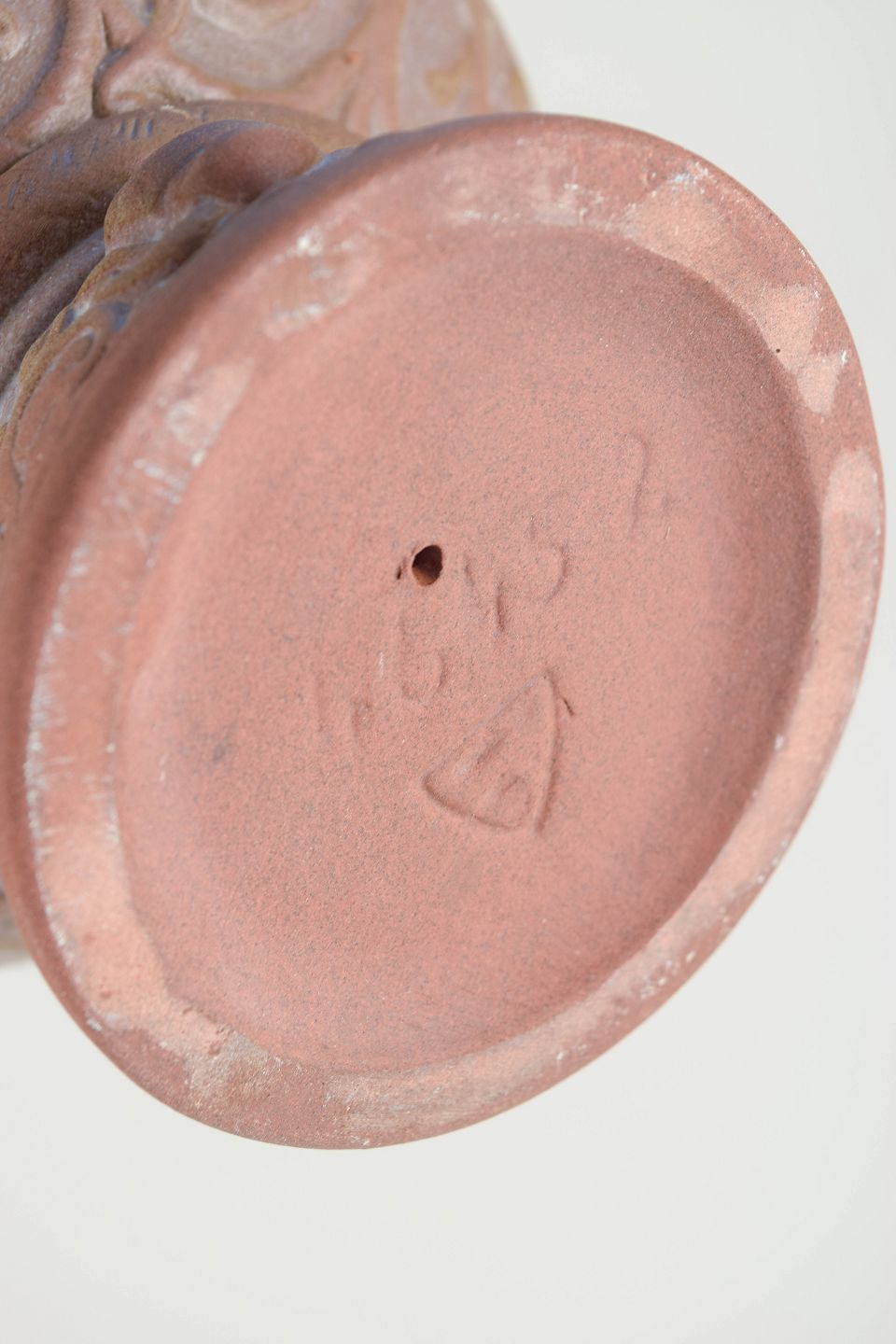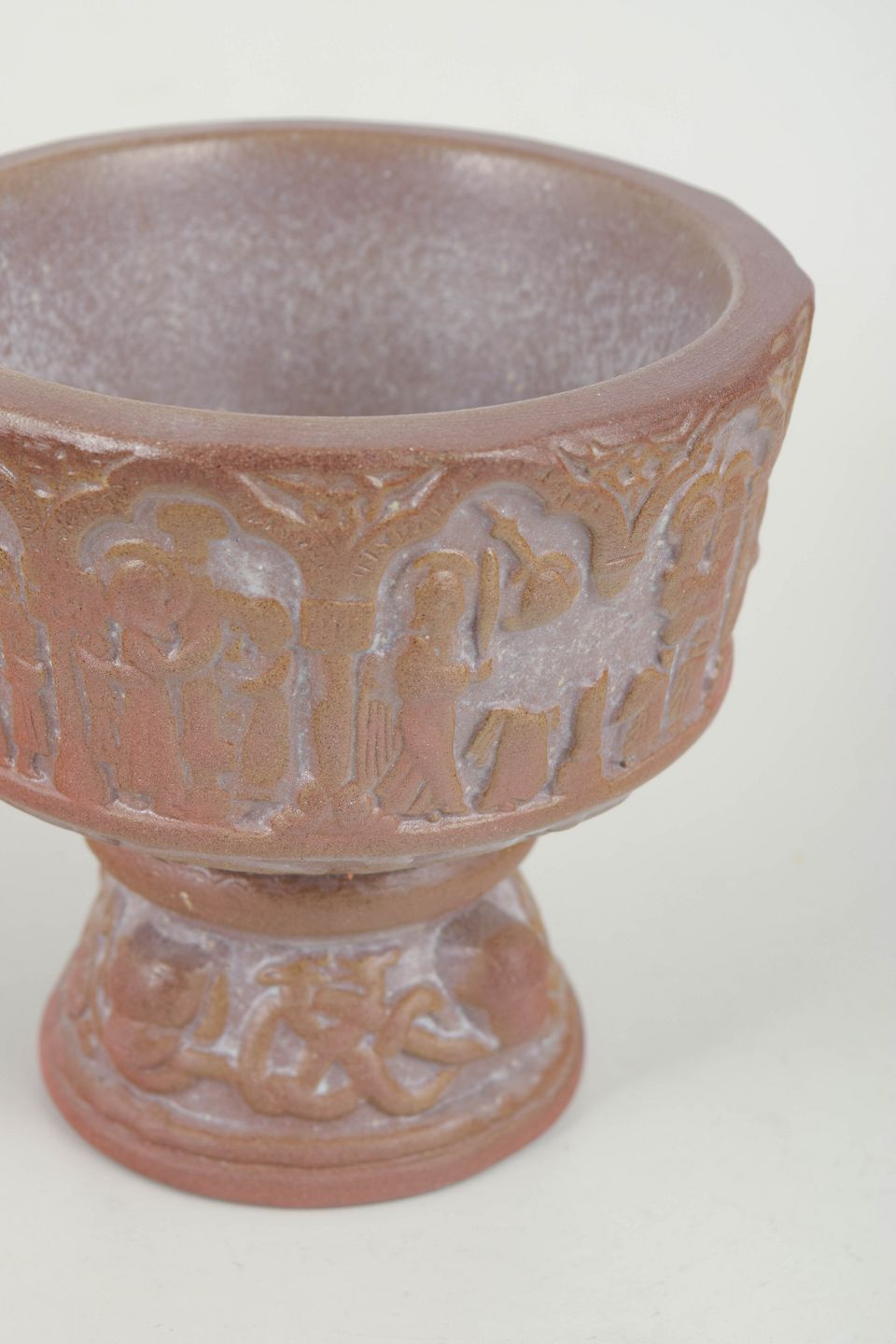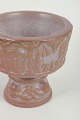 Reliefdekoreret stentøjsdøbefont med figural bort og profileret fod. Glaseret i varme rosa og brunlige nuancer. Udført med fabrikkens karakteristiske mærke.