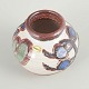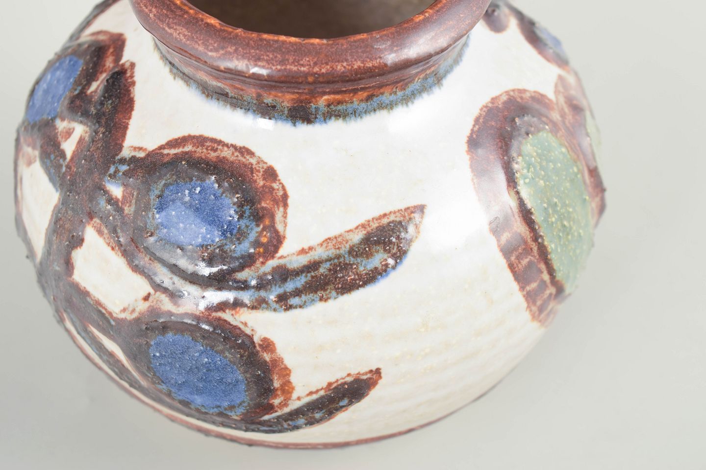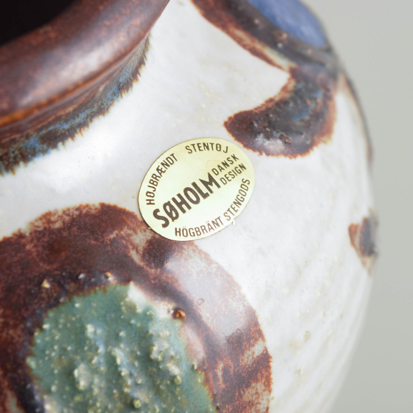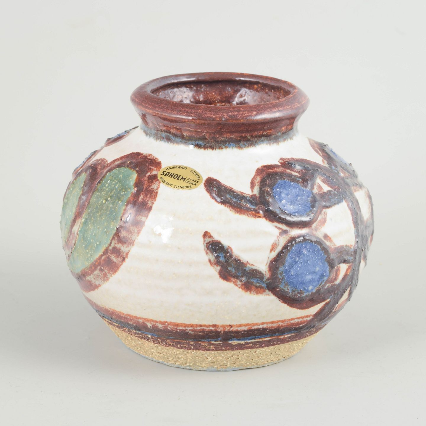 Rundbuget vase i drejet stentøj med lys bundglasur og hånddekorerede organiske motiver i blå, grønne og brunlige toner. Klassisk Søholm-udtryk fra perioden, med fabriksstempel under bunden og originale klistermærker bevaret.