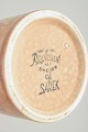 Cylinderformet vase i stentøj med mat, sandfarvet glasur og reliefdekoration med cirkulære og geometriske motiver. Modelnavn “Sarek” angivet i dekorationen.