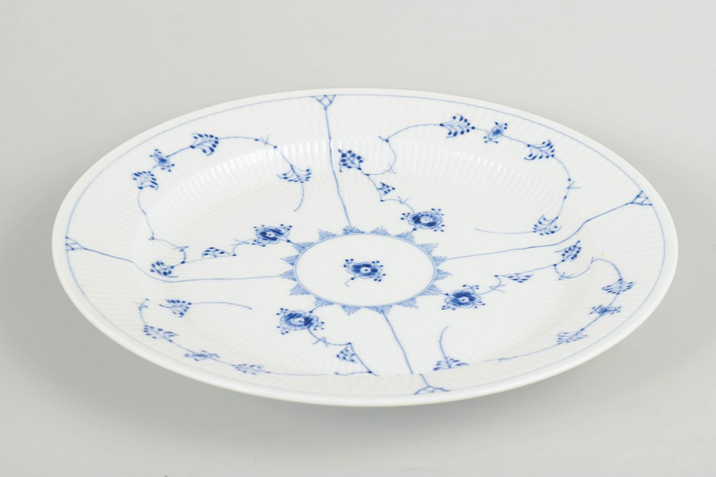 Rundt serveringsfad i porcelæn dekoreret i underglasurblåt med det klassiske Musselmalet Riflet-mønster. Model 1/107.