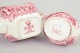 Kaffekande og sukkerskål i fajance fra Mason’s og Palissy, dekoreret i rød transferware med landskabs- og arkitekturmotiver.
