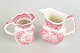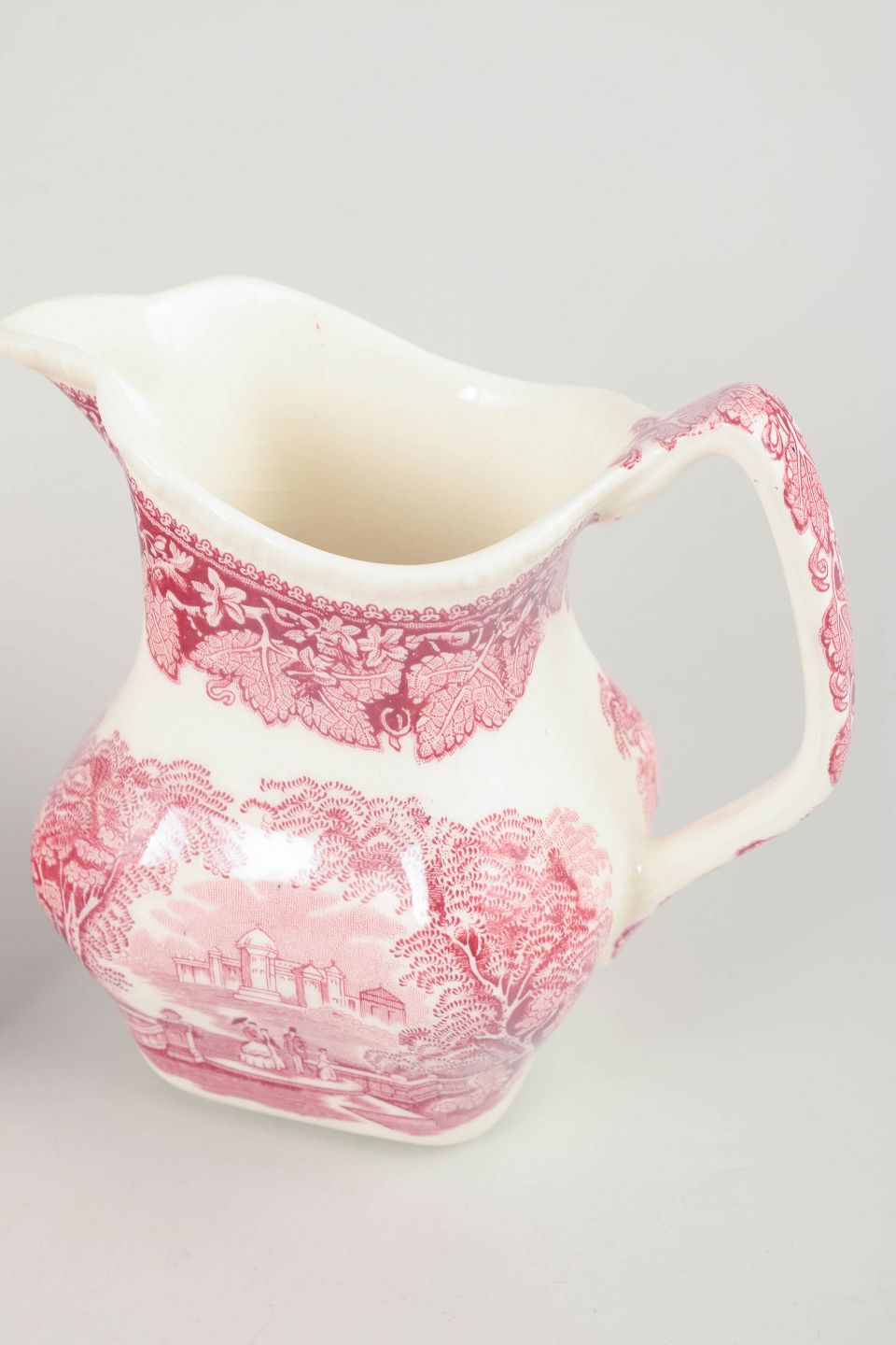 Kander i fajance fra Mason’s, dekoreret i rød transferware med landskabs- og arkitekturmotiver.
