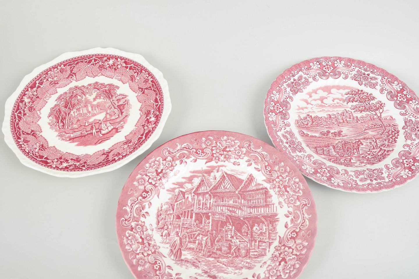 Middagstallerkener i fajance fra engelske producenter, dekoreret i rød transferware med landskabs- og ornamentmotiver.
