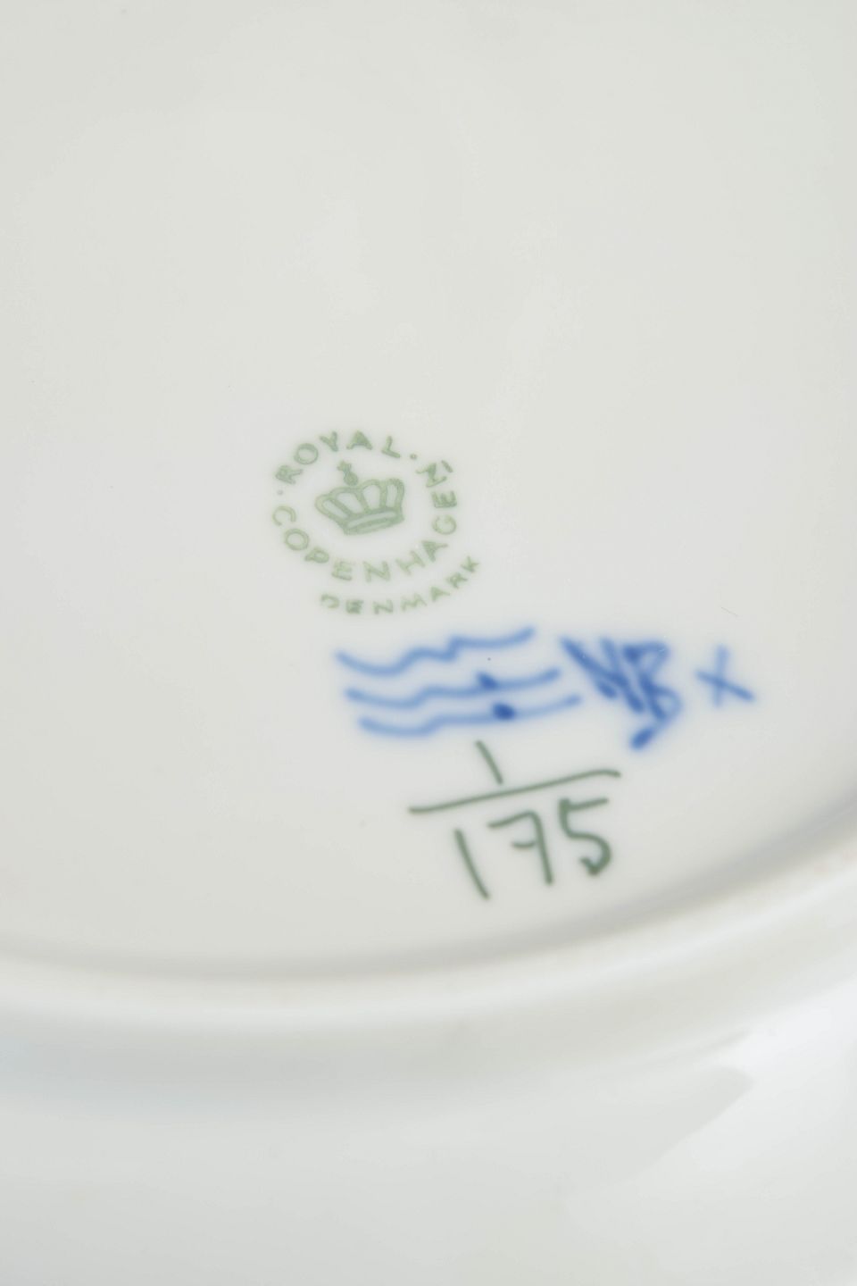 Royal Copenhagen blev grundlagt i 1775 og er Danmarks mest anerkendte porcelænsfabrik. Musselmalet riflet er fabrikkens ældste stel og har været i kontinuerlig produktion siden slutningen af 1700-tallet. Stellet er kendetegnet ved den riflede form og den præcist håndmalede blå dekoration, udført efter faste traditionelle mønstre, hvilket gør hver genstand til et klassisk eksempel på dansk porcelænshåndværk.