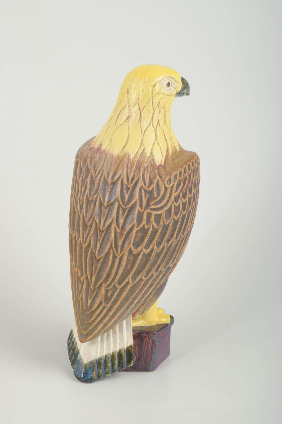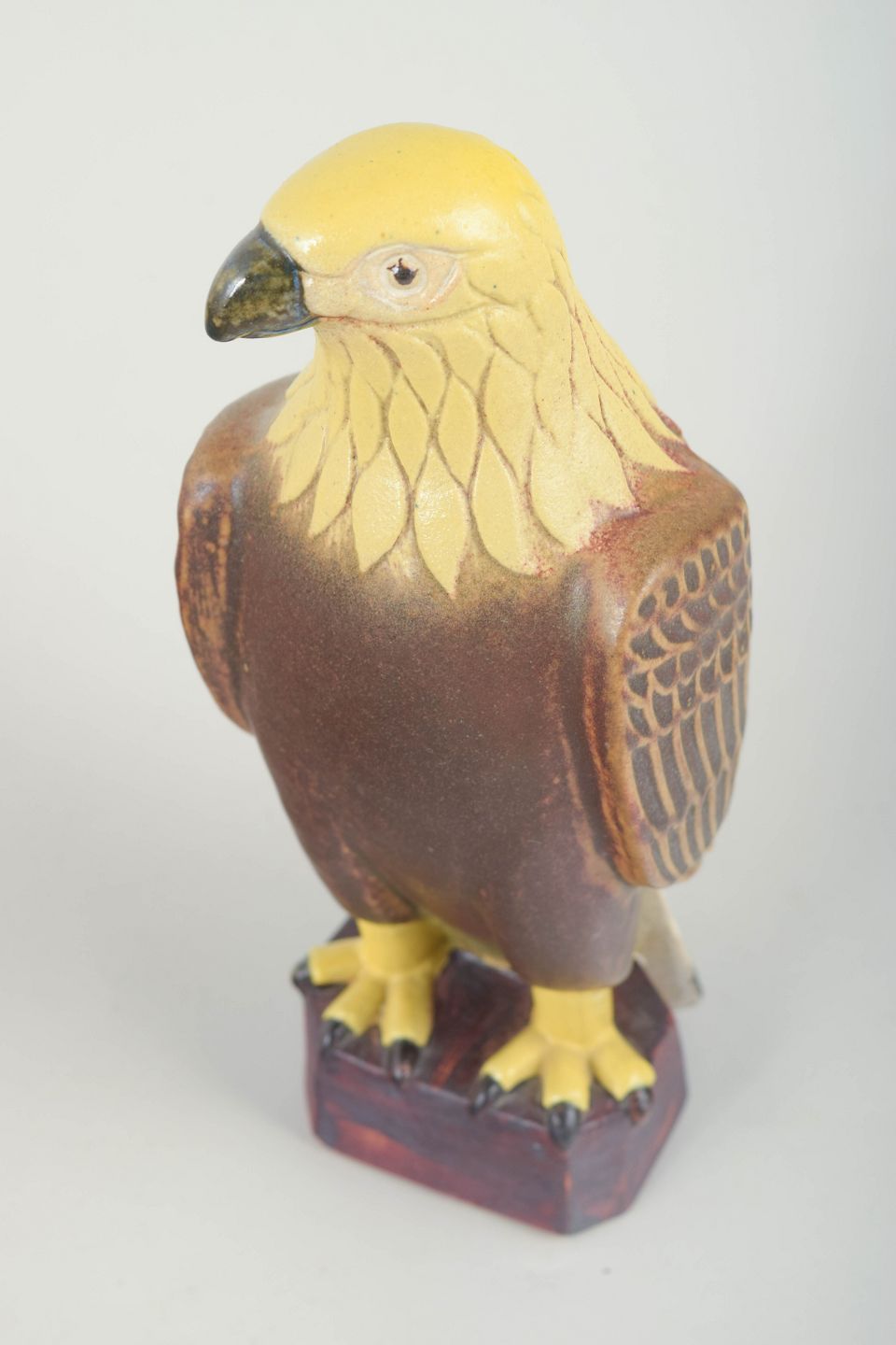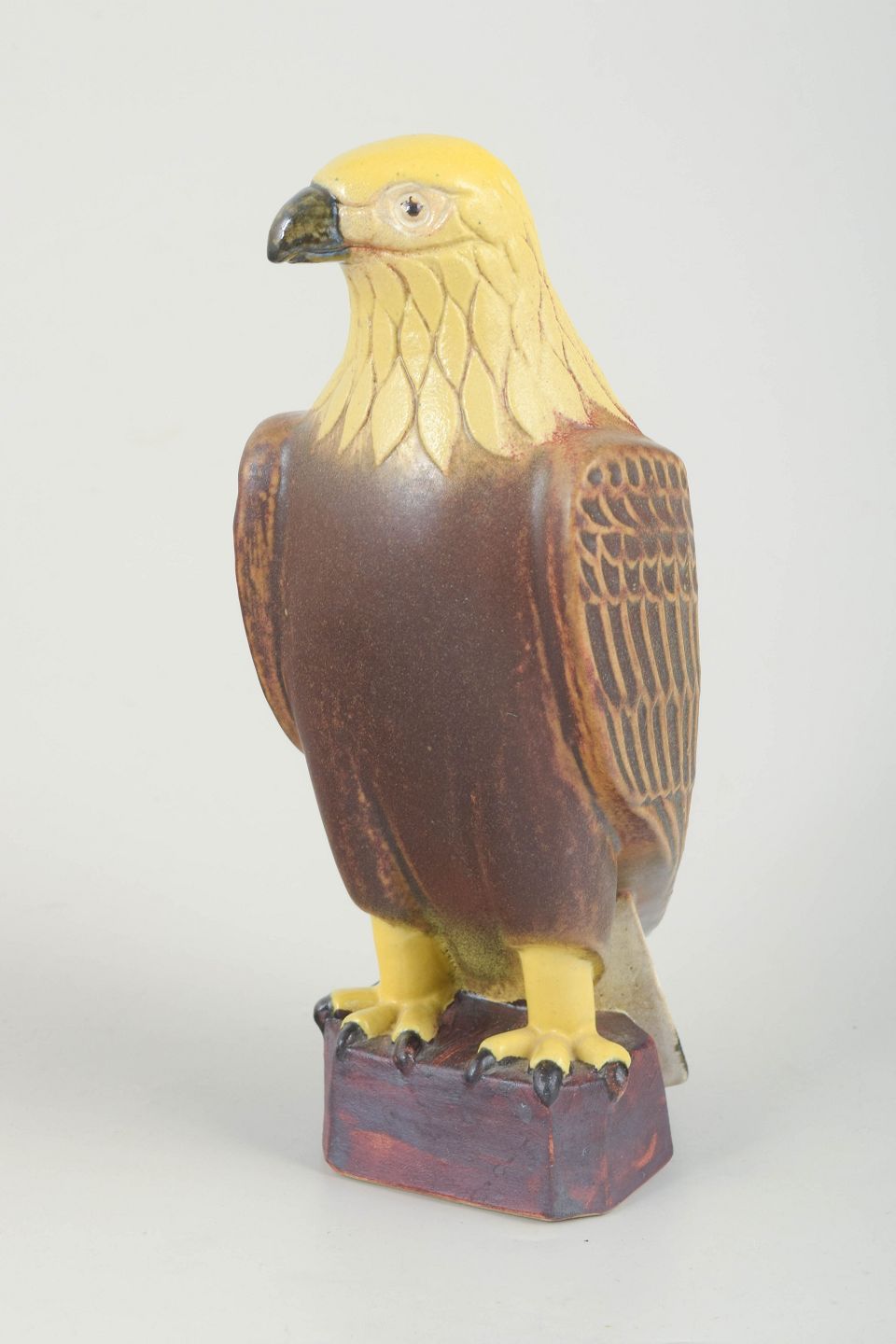 Naturalistisk udformet falkefigur i glaseret stentøj med brun krop, gul hoved- og brystparti samt detaljeret dekoration på vingerne. Figuren står på en firkantet base og er stemplet EGO Stengods, Lidköping, Sverige samt modelnummer i bunden.