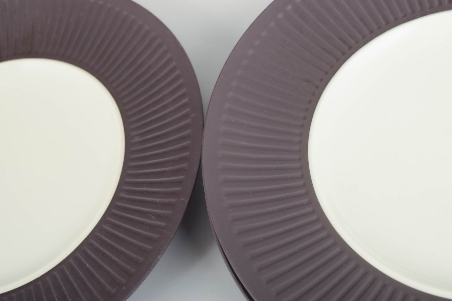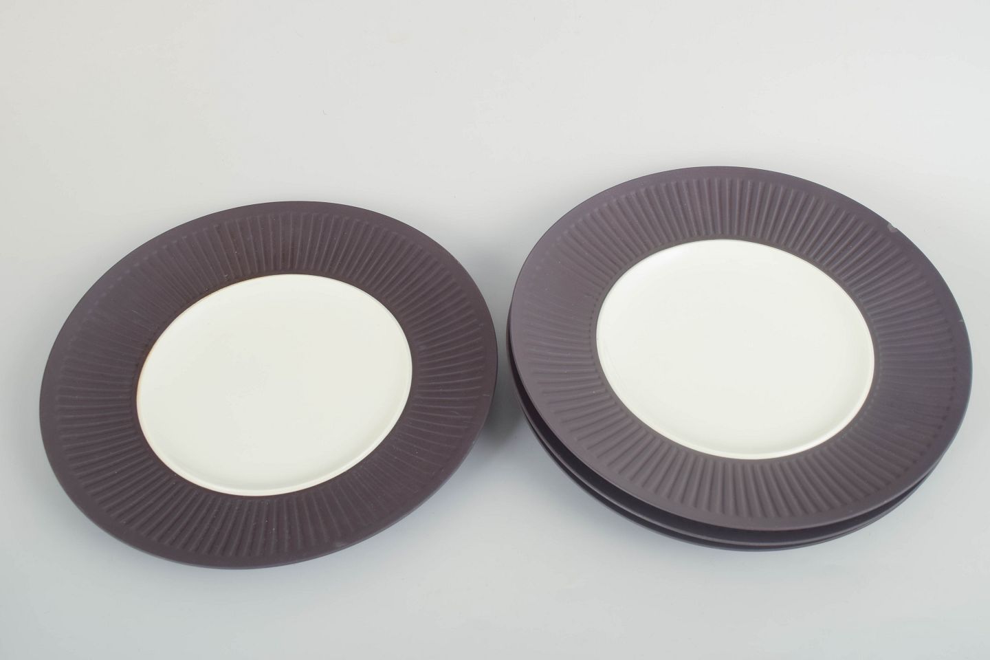 Sæt bestående af tre middagstallerkener i stentøj med hvid glasur og rillet fane samt lys glasur i spejlet.