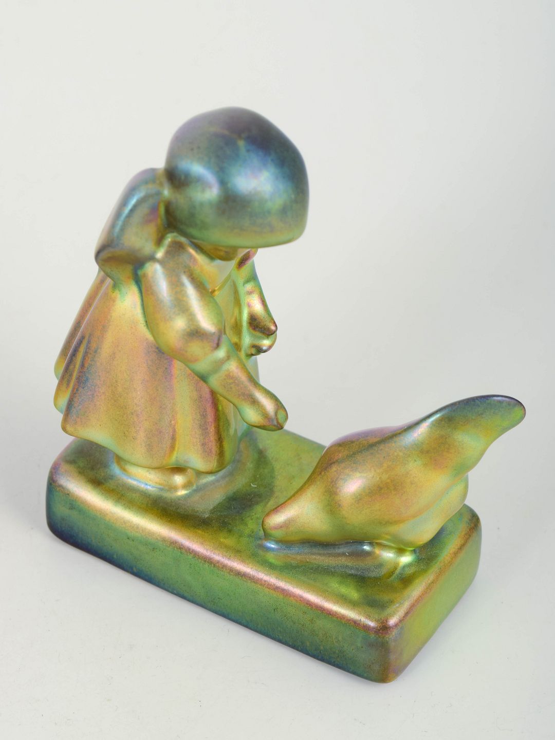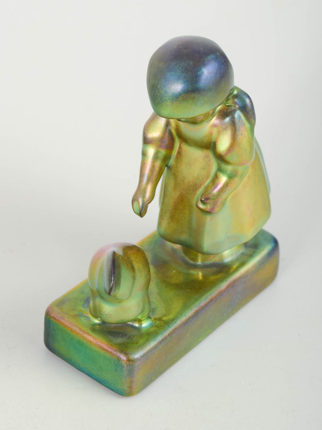 Dekorativ figurgruppe i keramik med iriserende eosin-glasur i grønne og gyldne nuancer. Motivet forestiller en pige stående foran en høne på rektangulær plint, udført i stiliseret art deco-form.