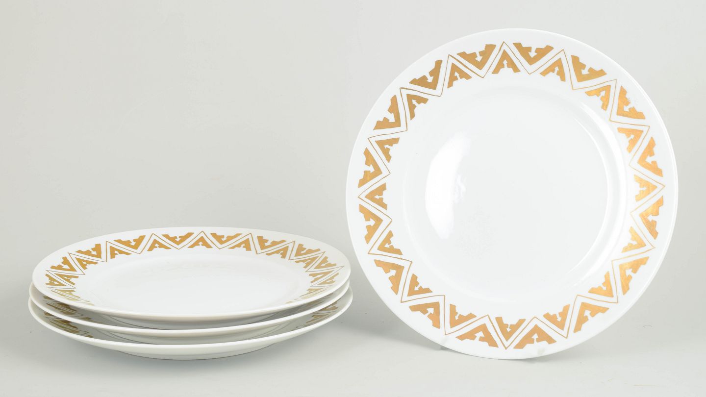 Sæt af fire store middagstallerkener i porcelæn med geometrisk dekoration i Art Deco stil langs fanen. Annulleret med to indridsede streger under bunden. Fremstillet i 1959.