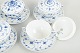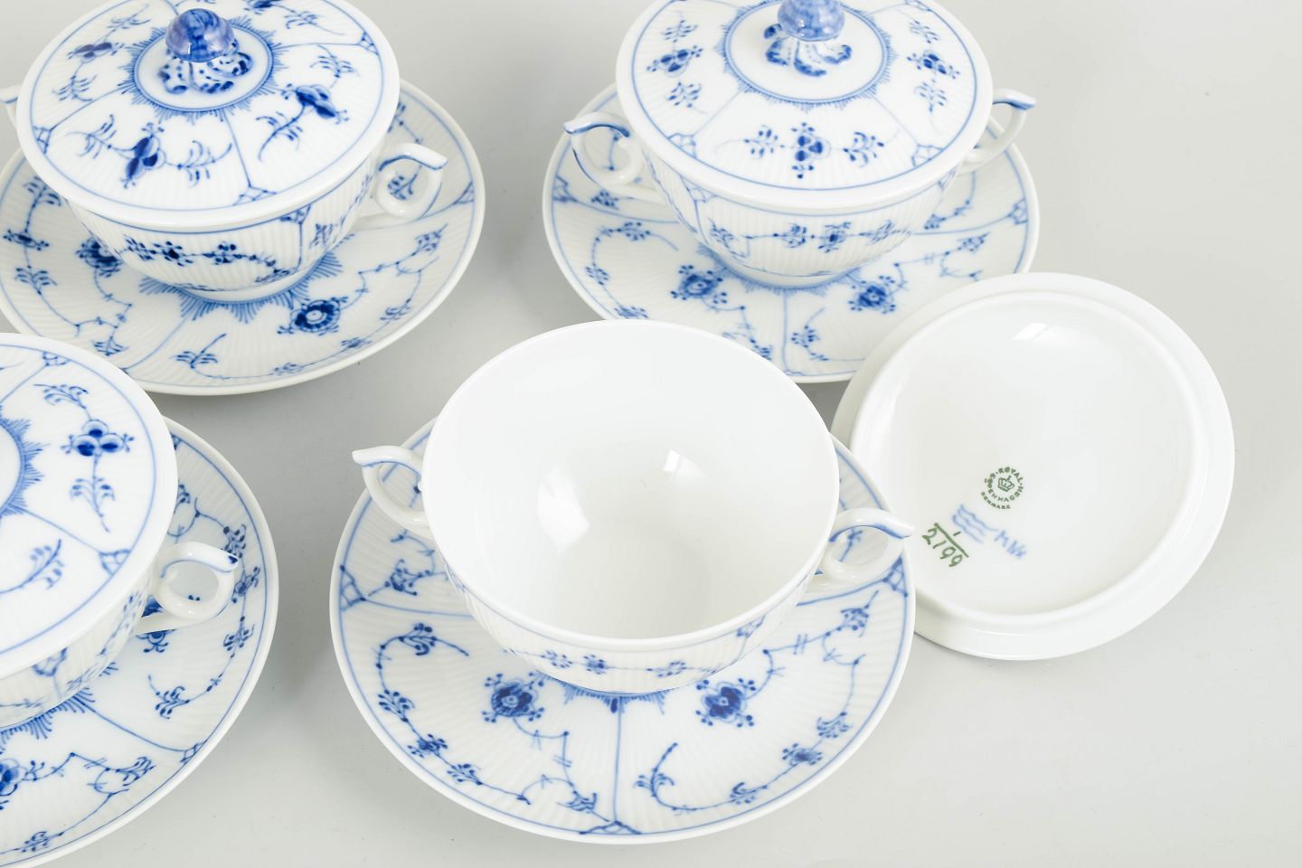 Sæt på fire bouillonkopper med tilhørende underkopper i håndmalet porcelæn fra Musselmalet Riflet med klassisk underglasurdekoration i koboltblå. Model 1/2199. Nogle dele er første sortering, andre er annulleret med én indridset streg under bunden.
